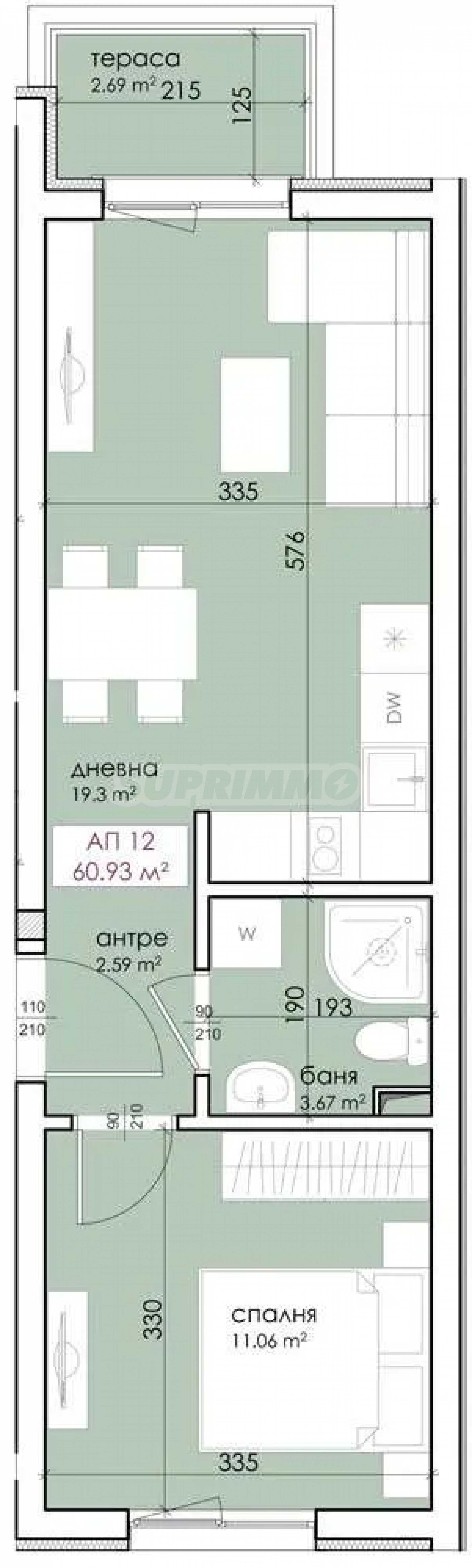 The apartment consists of an entrance hall, living room/kitchen of 19.3 sq m, terrace - 2.69 sq m, bathroom/toilet - 3.67 sq m, bedroom - 11.06 sq m.