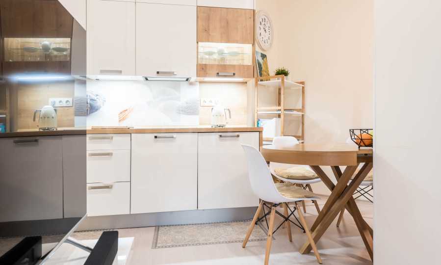 The apartment is furnished and equipped with everything necessary for living, such as furniture and electrical appliances of the highest class.