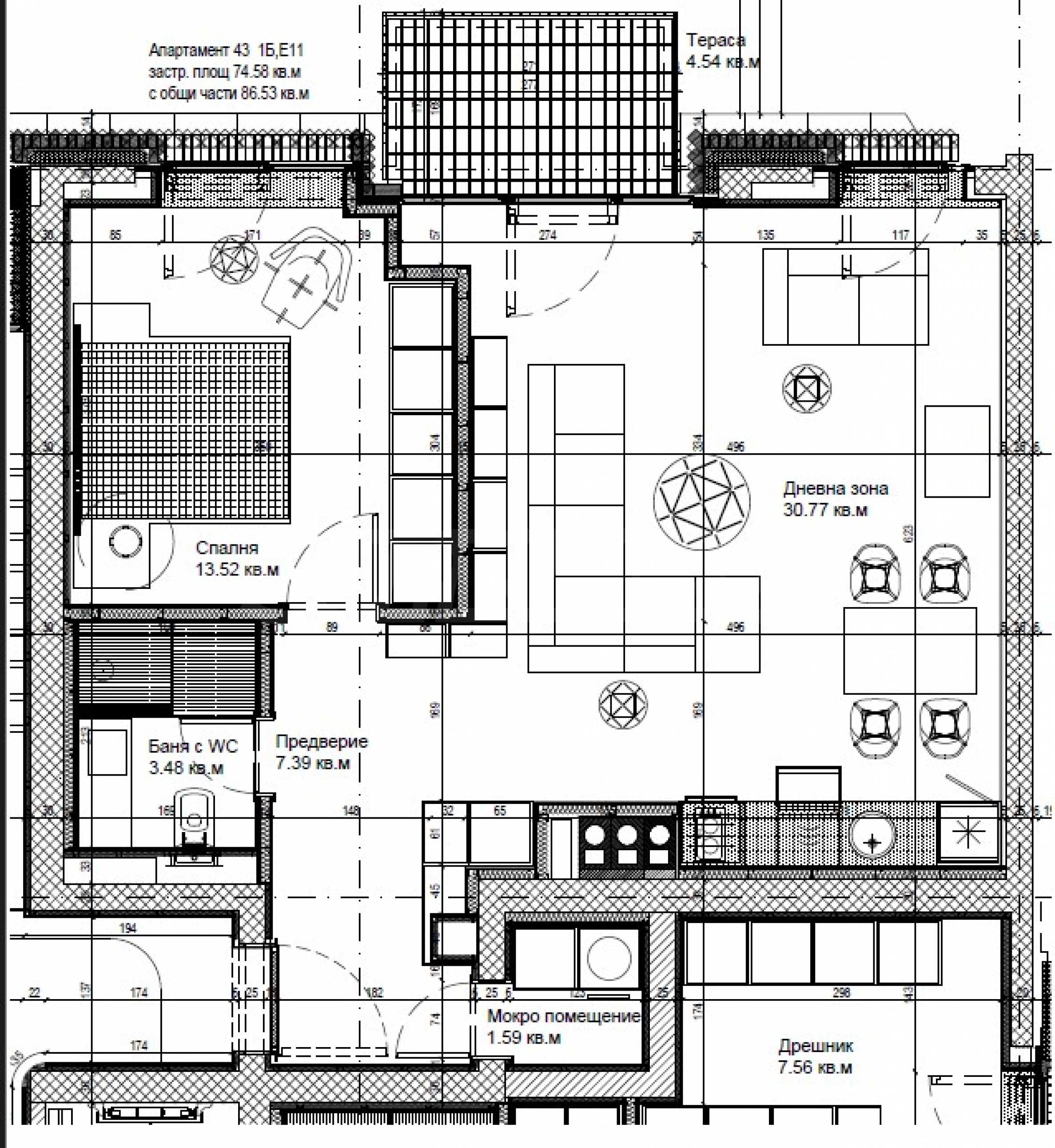 The two-room apartment has a total area of 86.53 m2 and a net area of 74.58 m2 and has the following layout: