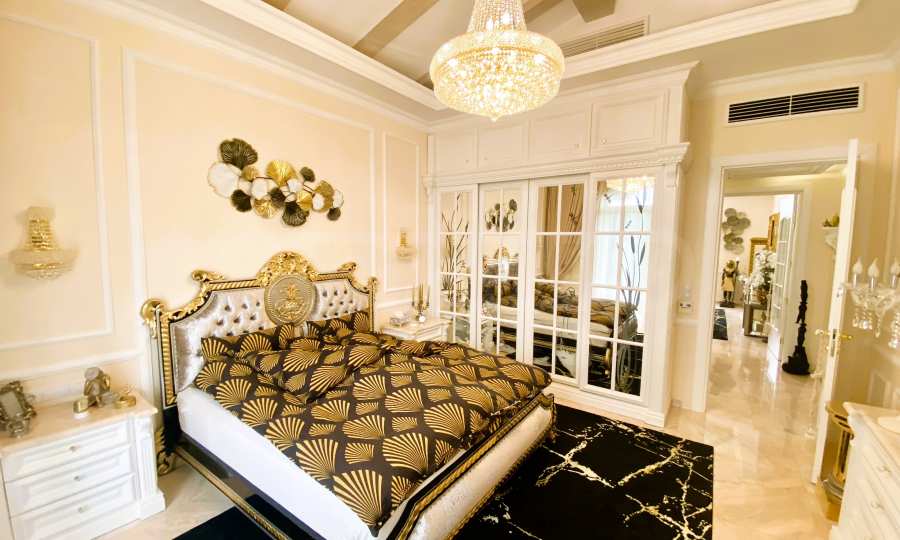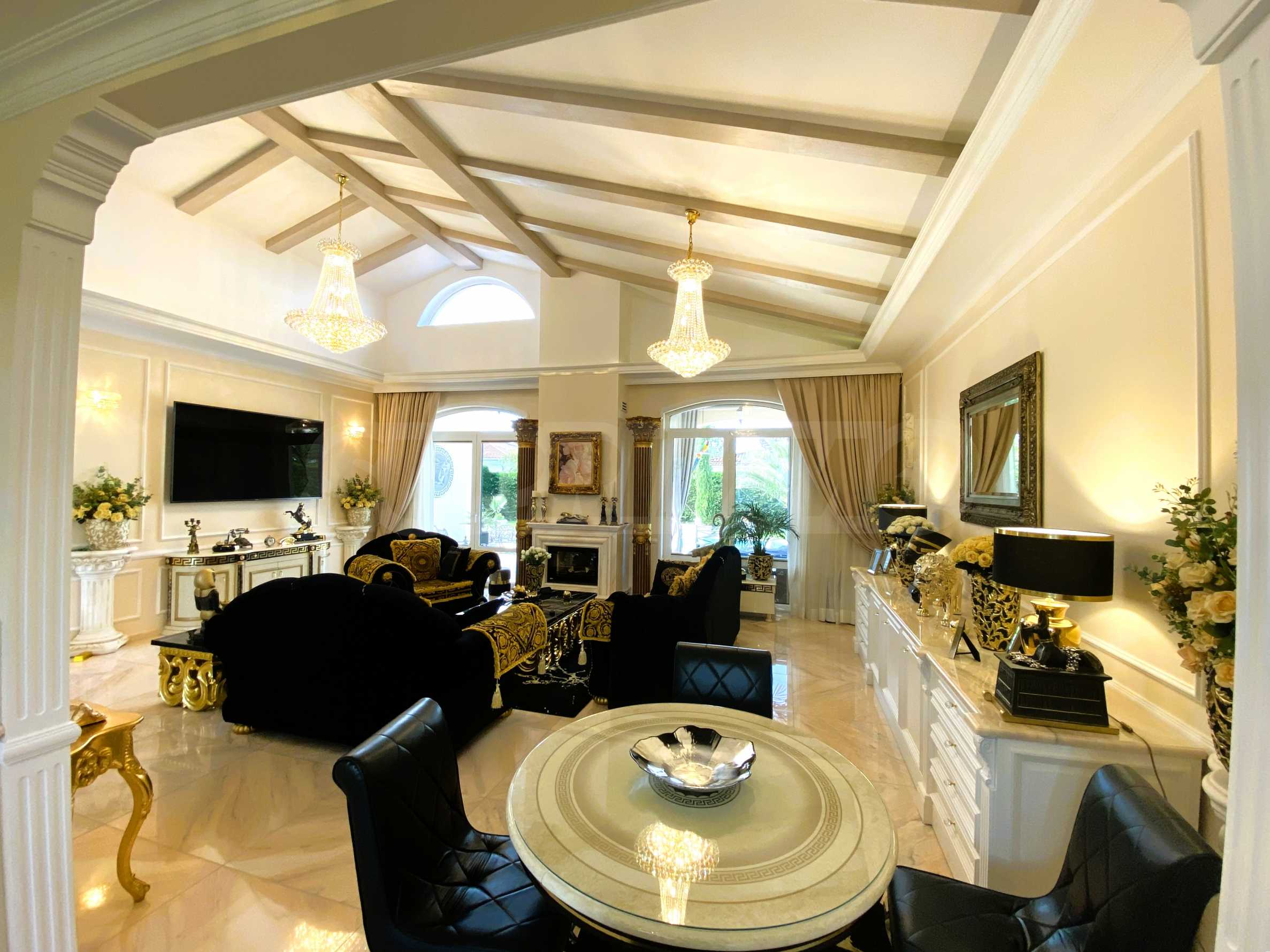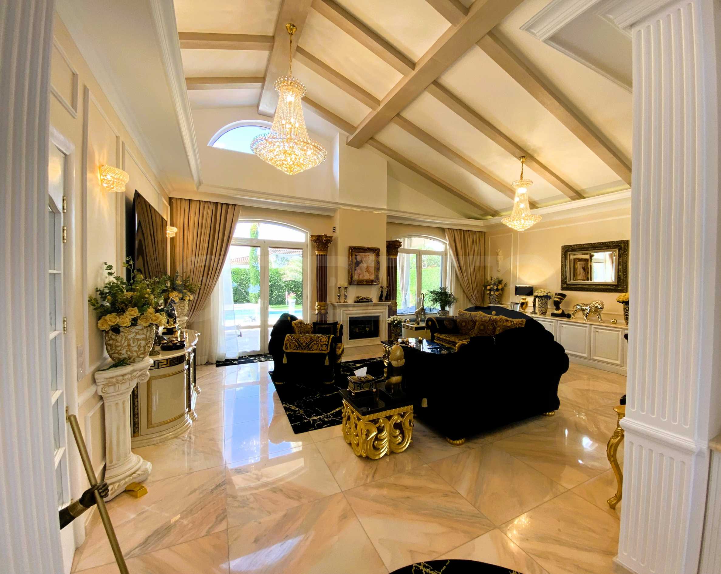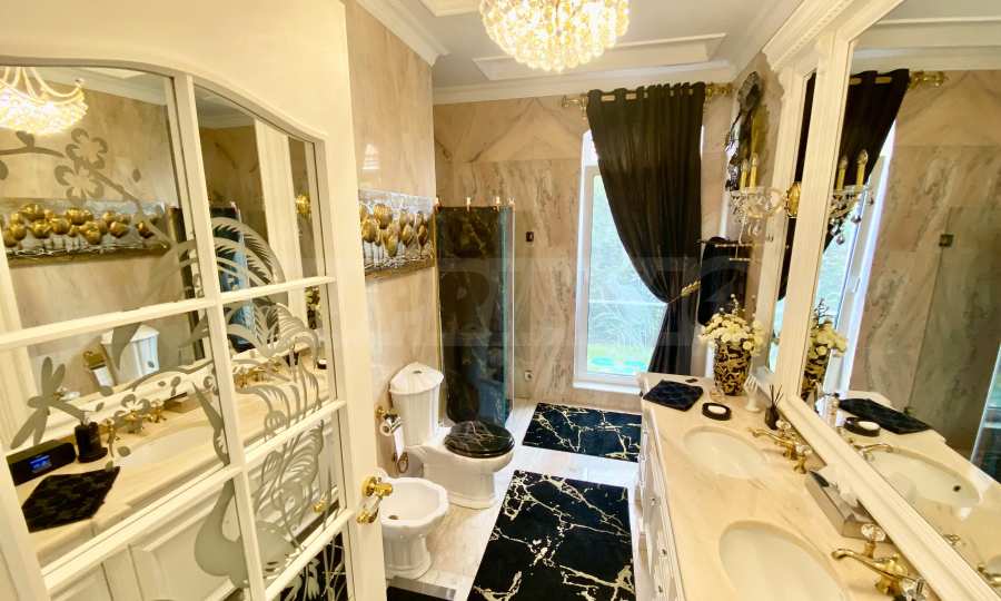 The villa is elegantly furnished with custom-made furniture. The interior uses luxurious natural materials, "Rosso portogalo" marble and wood.