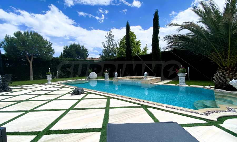 In the richly landscaped garden with exotic trees and flowers, there is a centrally located swimming pool with jacuzzis, completely lined with natural stone "Rosso portogalo". It also has a covered parking space next to the entrance.