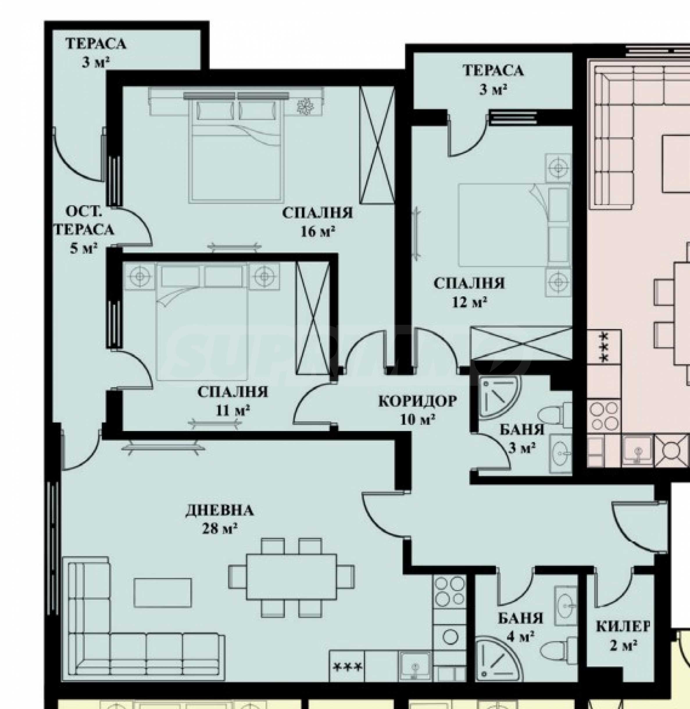 - bedroom 1 - 12 sq m with terrace 1 - 3 sq m;