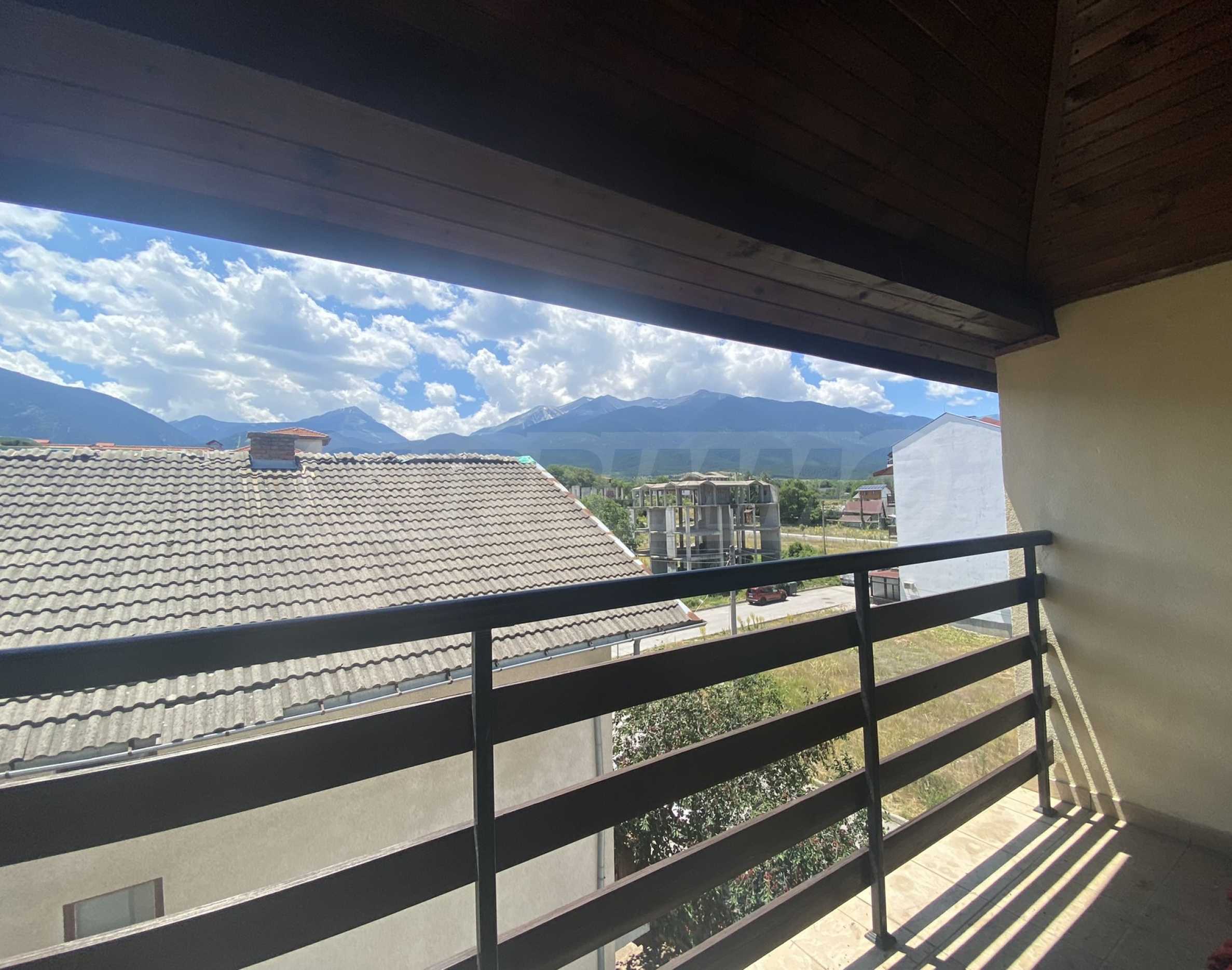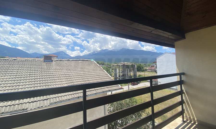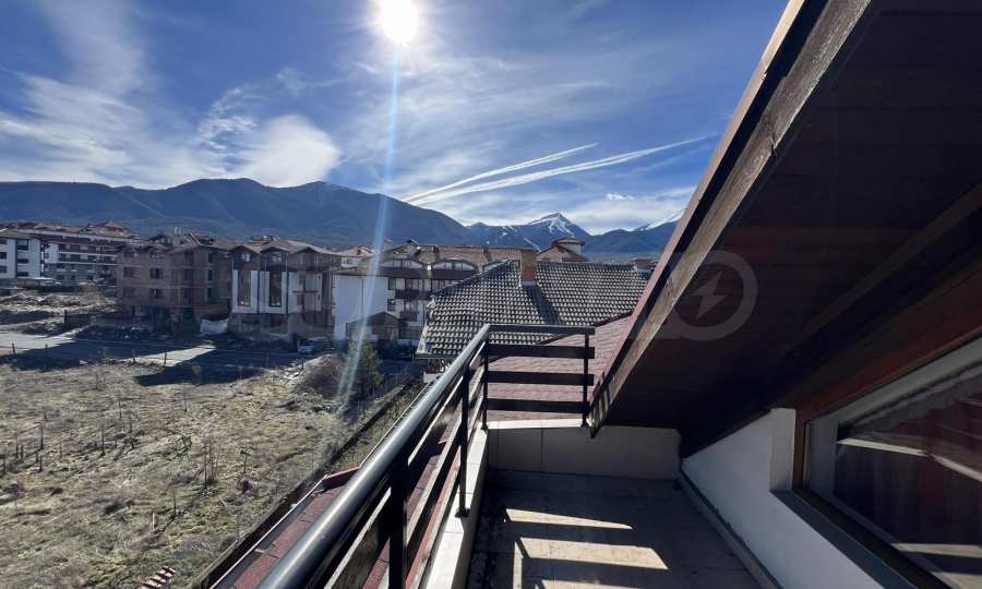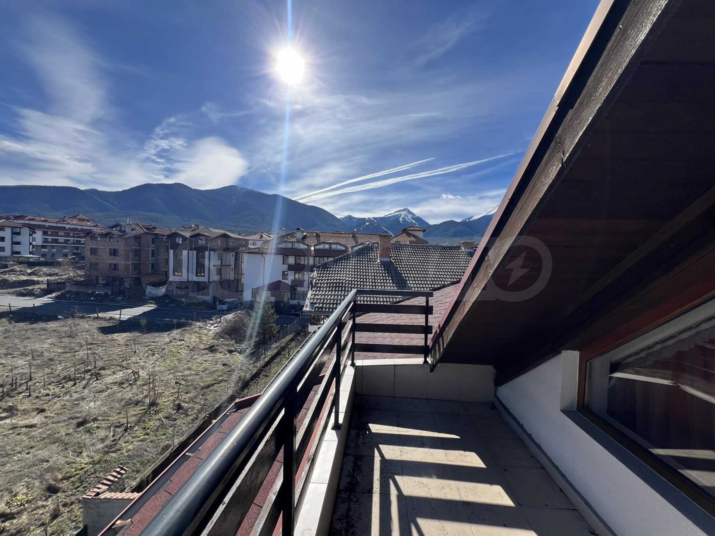 living room with sofas, TV and balcony with incredible views of Rila and Pirin Mountains;