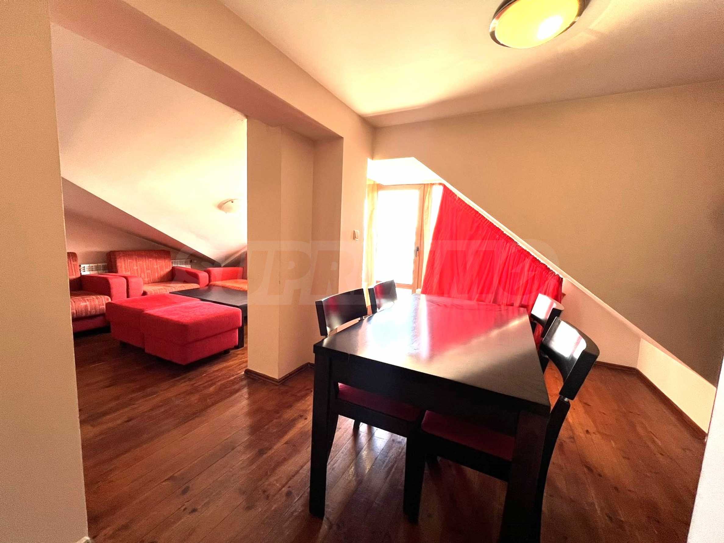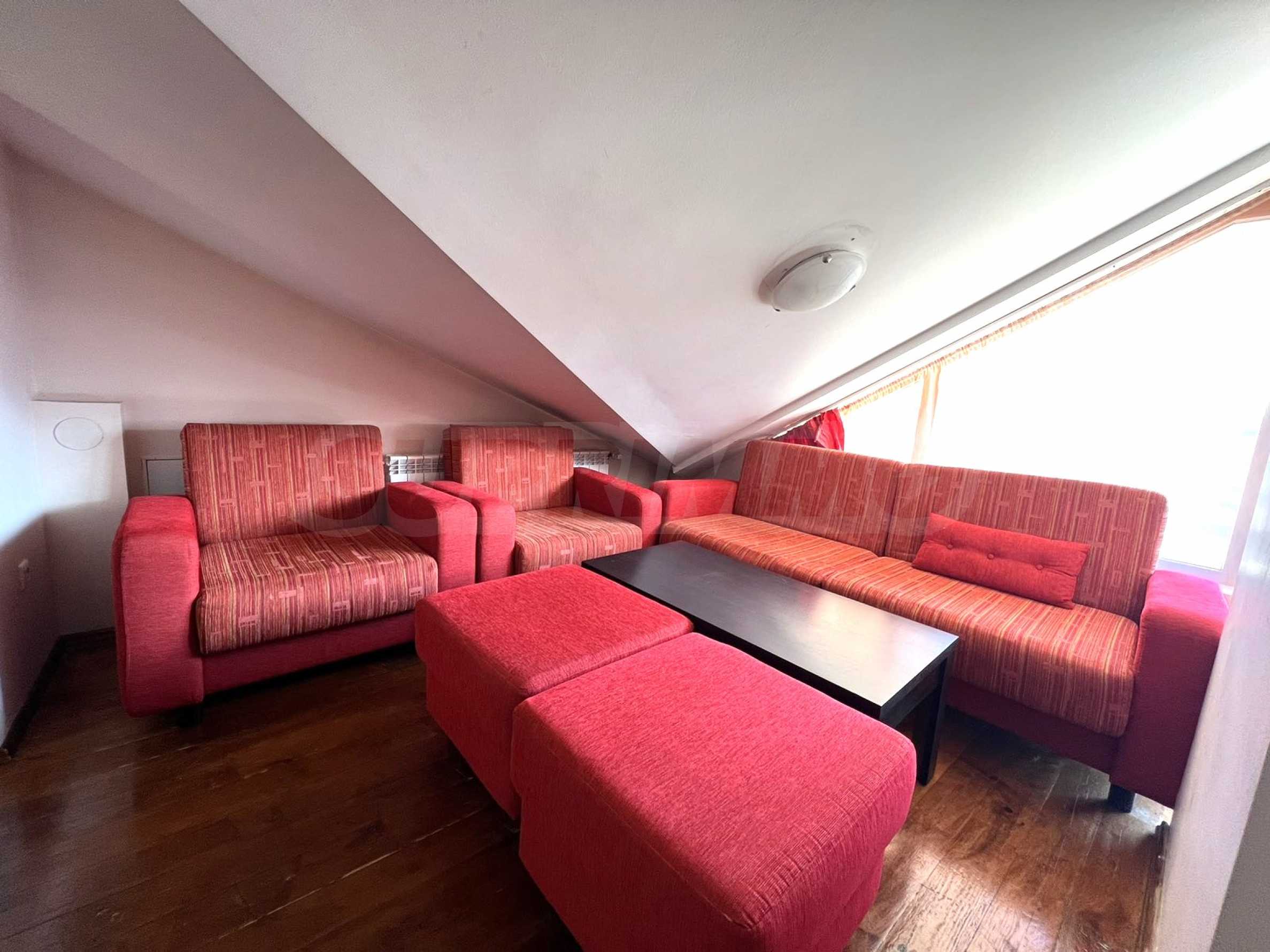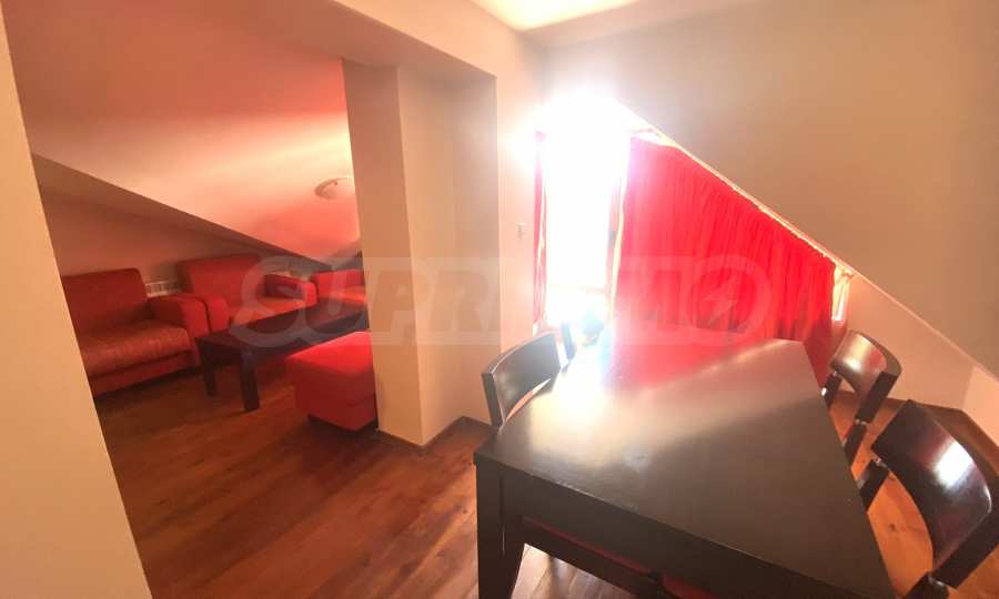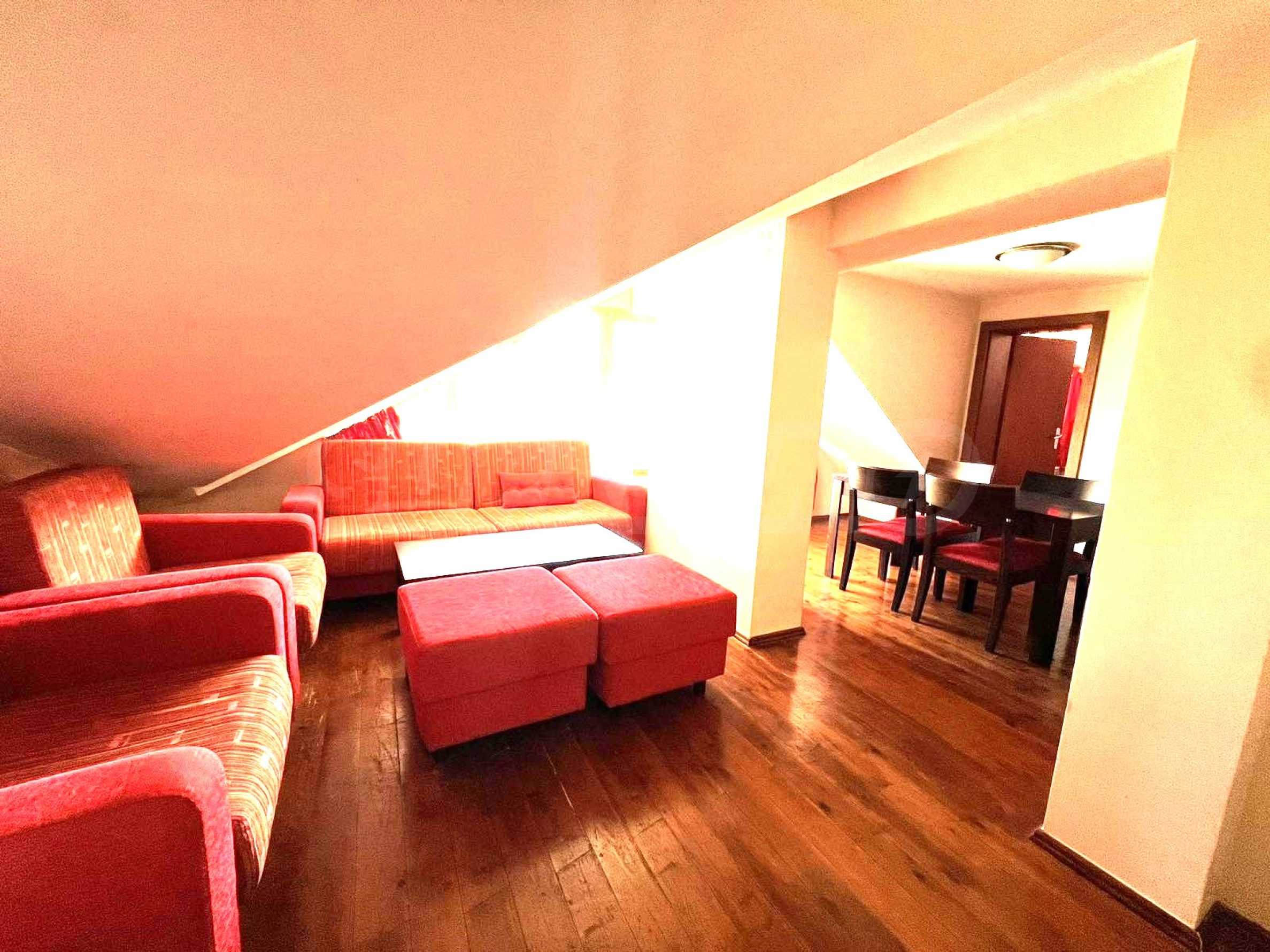 living room with sofas, TV and balcony with incredible views of Rila and Pirin Mountains;