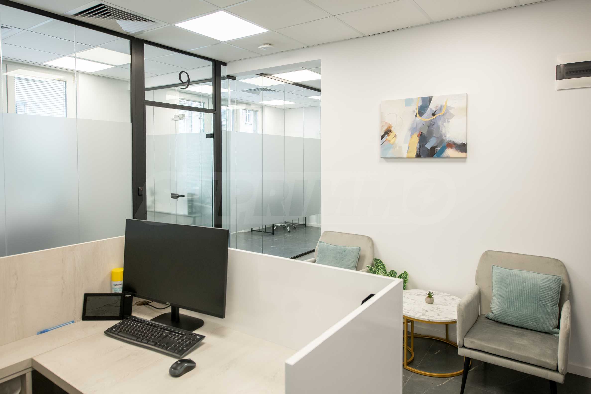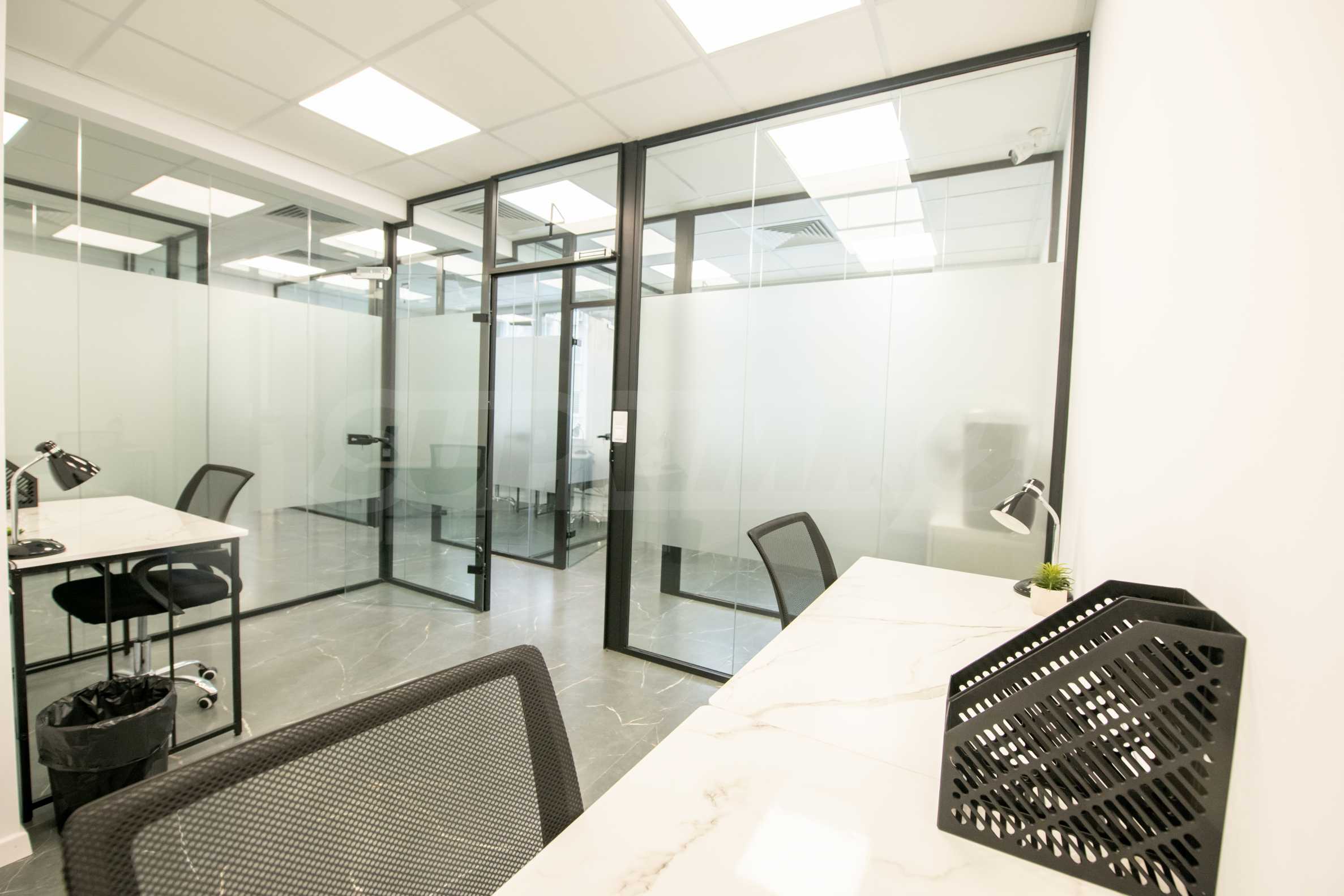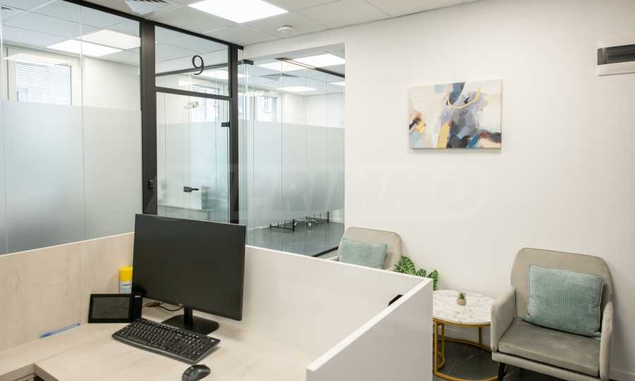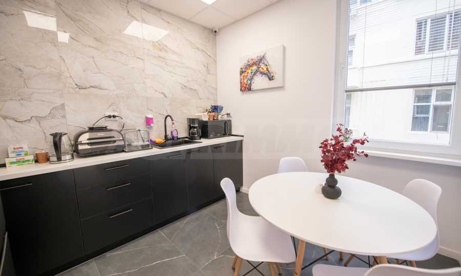 The premises are finished and equipped with 20 workplaces as seen in the pictures. The space is divided between 10 independent work rooms of different sizes, a reception, a kitchen with a place to eat, a printing corner, sanitary facilities, a corner for rest and socialization. Each room is fully equipped and prepared for work process.