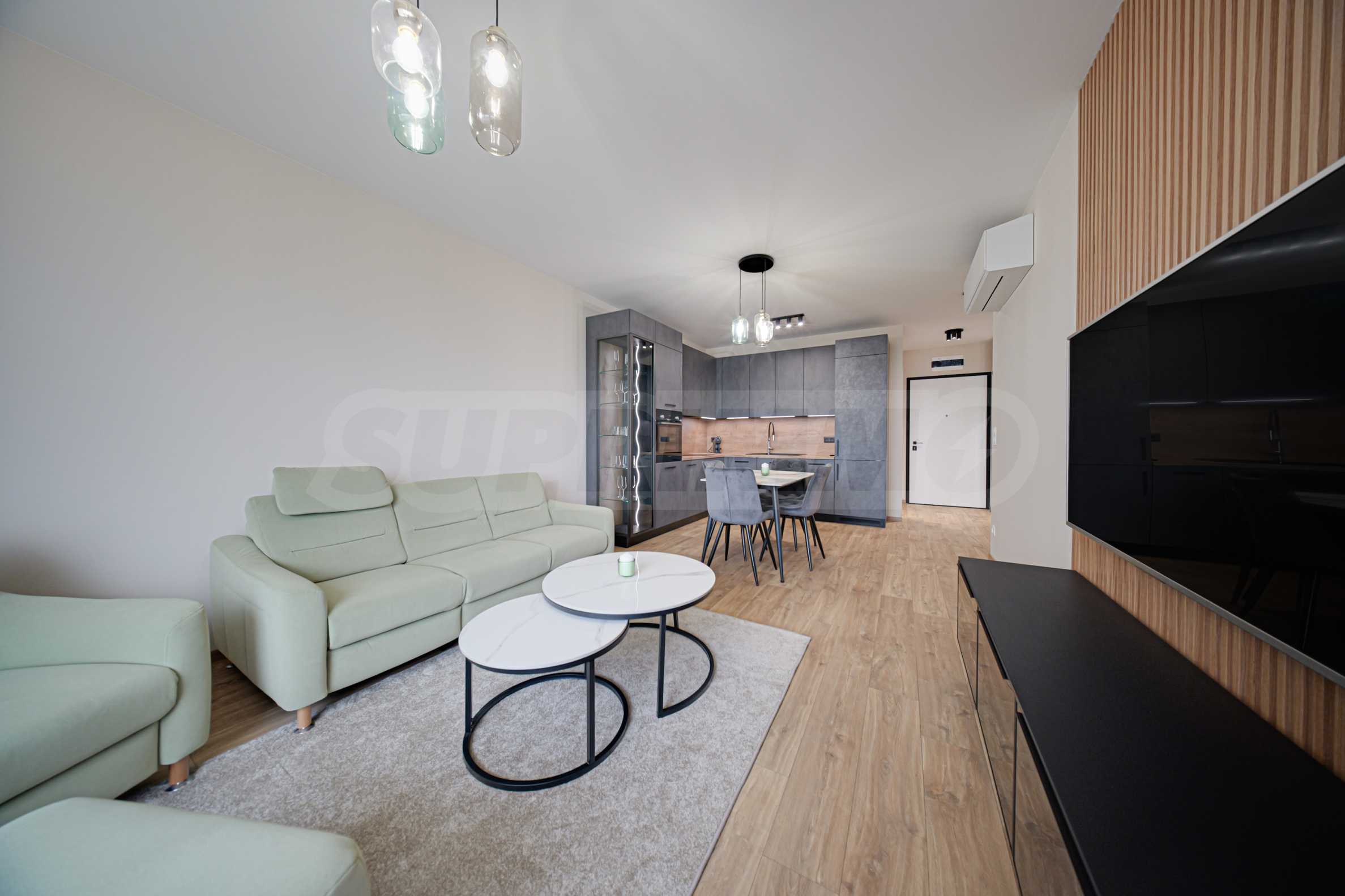 The apartment offers a spacious living room with luxurious furnitures, a cozy bedroom furnished with Italian furniture, a large bed and an equipped kitchen with high-end appliances.