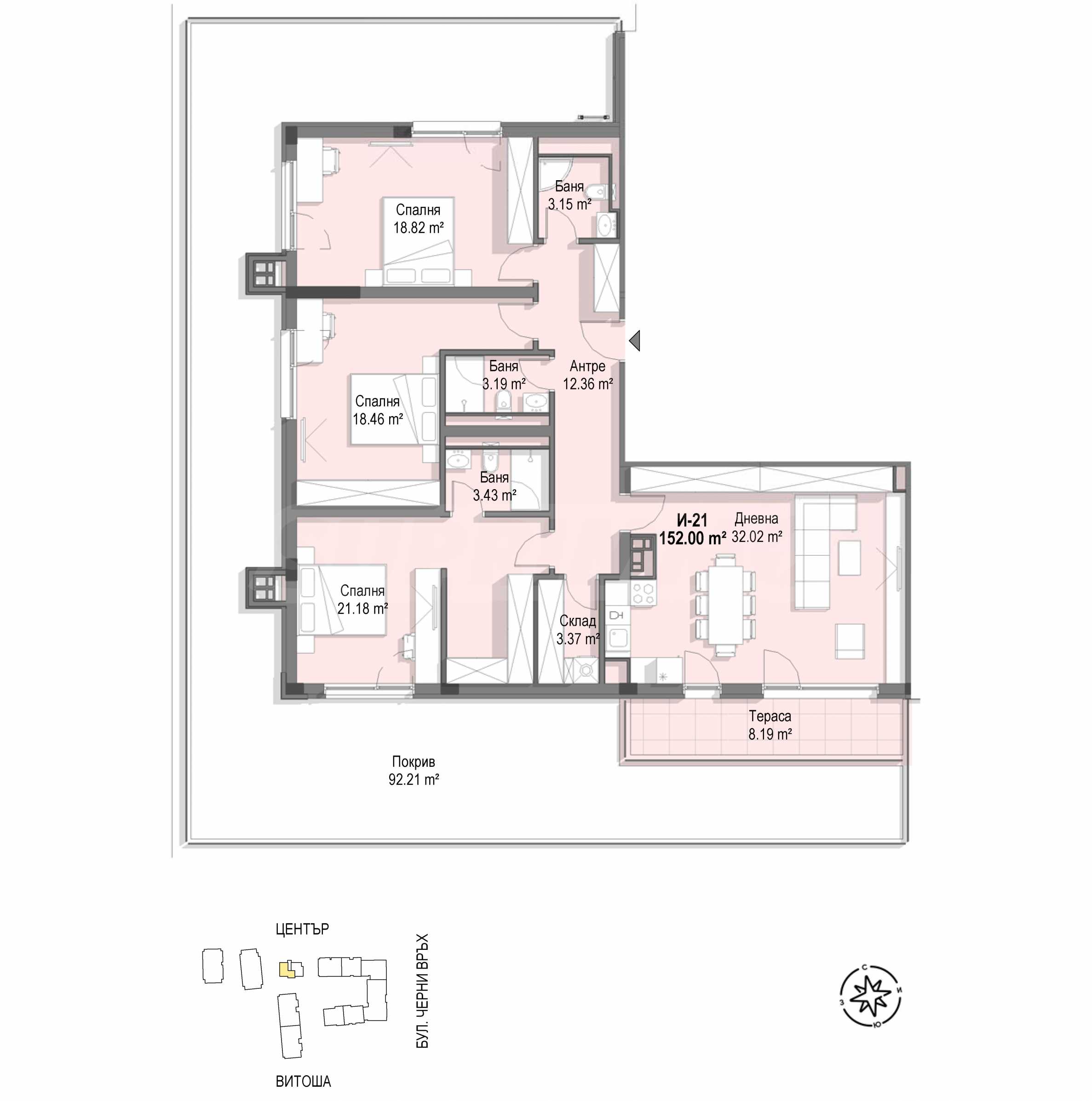 The apartment is functionally distributed and offers spacious rooms with regular shapes. The total area of the house is 178.47 m2., of which the net area is 152 m2. and 92 m2. roof terrace. The distribution includes: