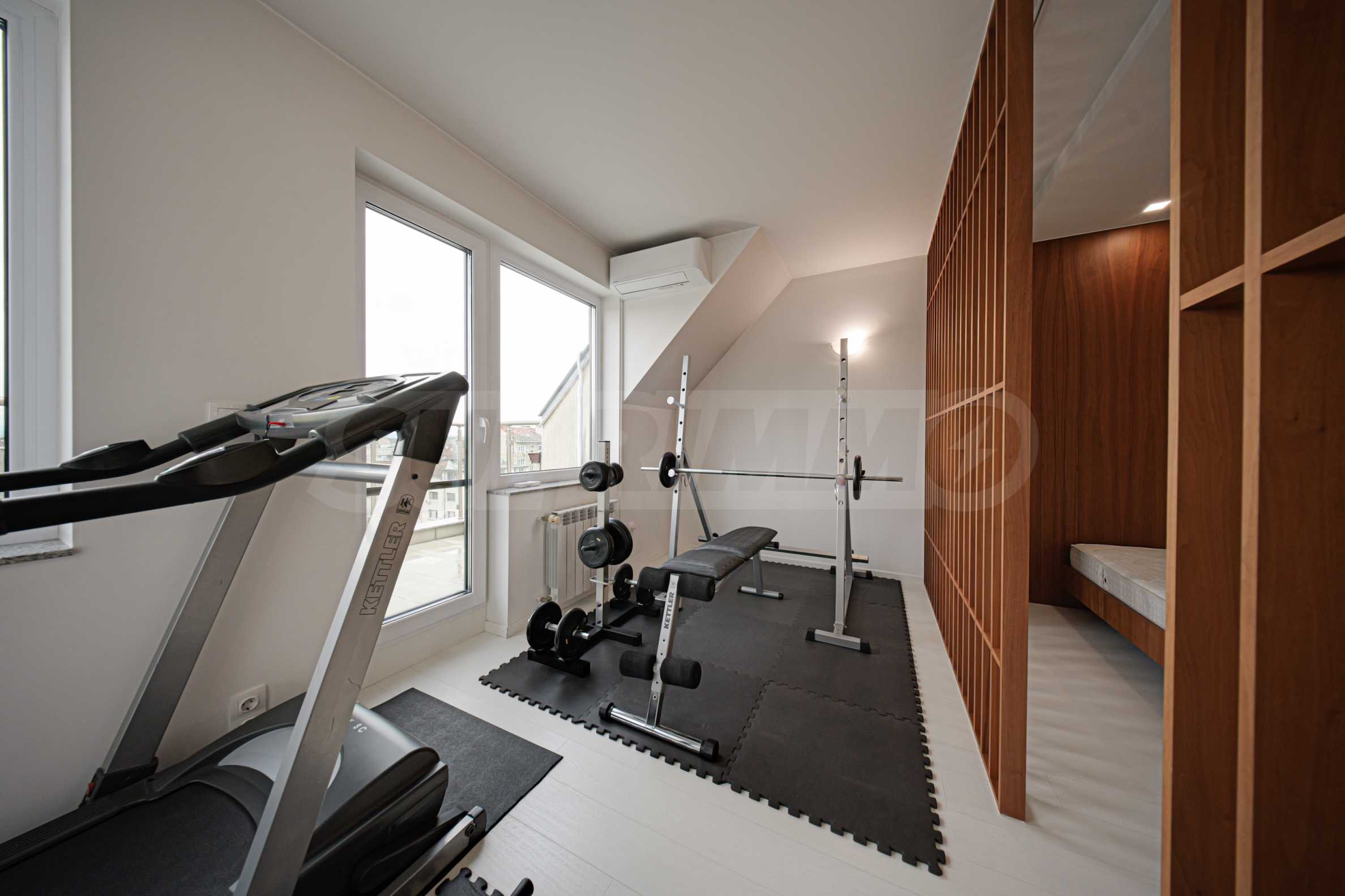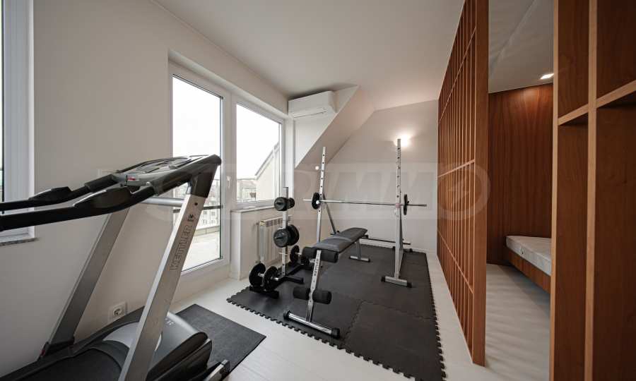 It consists of 180 sq m, distributed as follows: living room with kitchen (south facing), study (south facing), children's/guest bedroom with two separate beds (north facing), huge bedroom with gym (north facing), three bathrooms and toilets and a storage/wet room, with each room having a terrace.