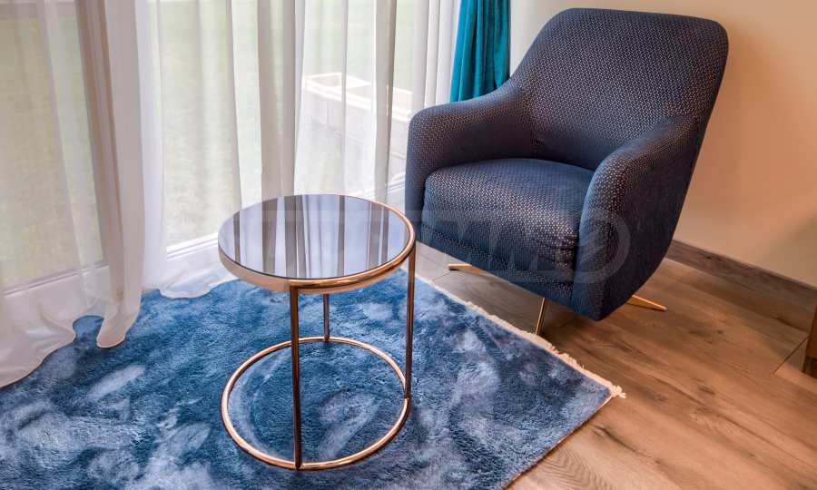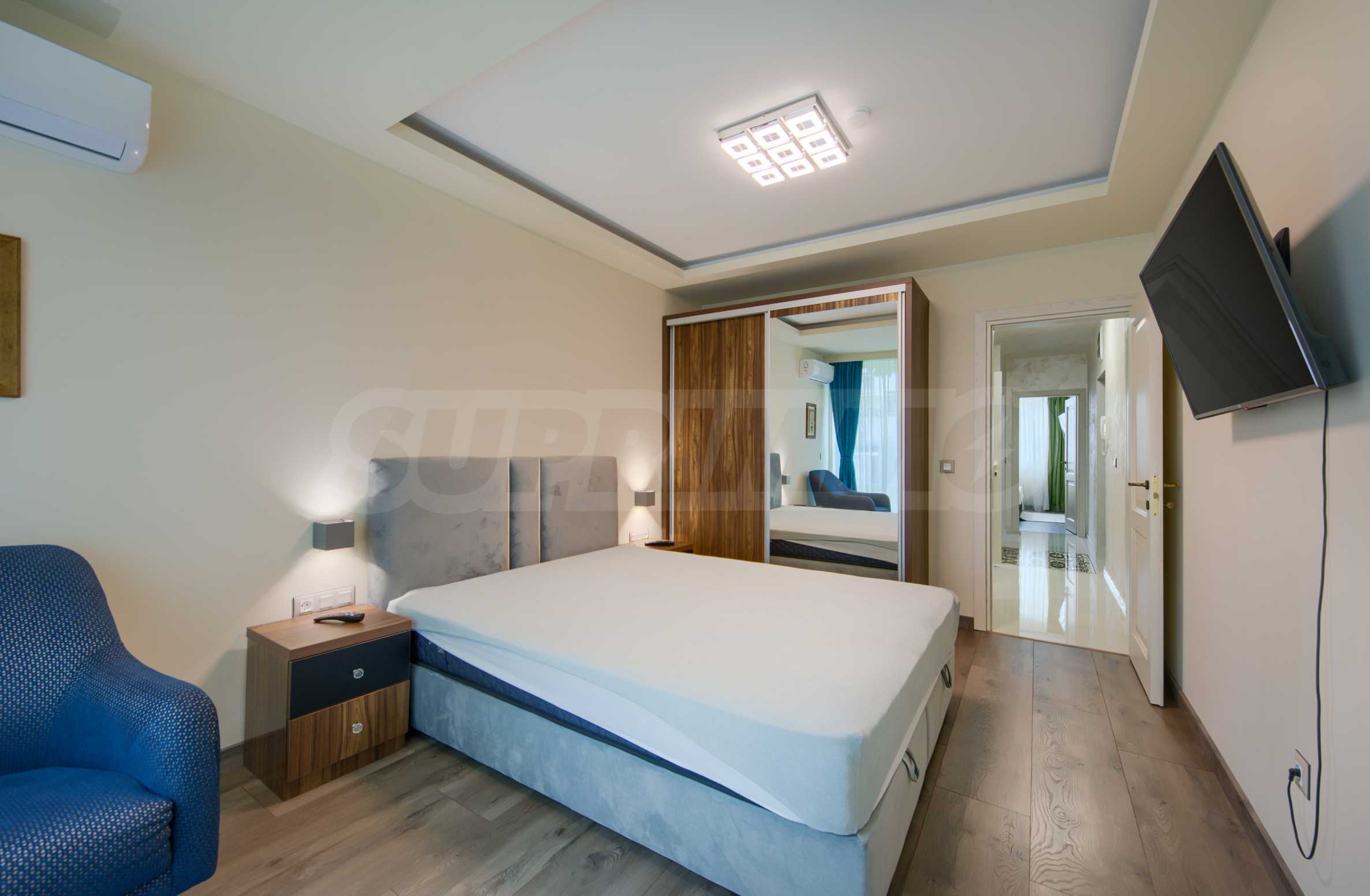 The bedrooms are fully furnished with double beds, built-in wardrobes and 42 inch LG smart TVs, and the larger bedroom has an additional space for relaxation, with a large comfortable armchair.