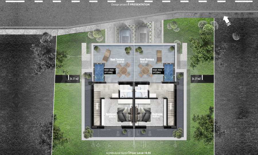 - The third floor has an area of 68.54 sq m and consists of a hallway and 2 large bedrooms with private bathrooms, as well as a large terrace with an area of 89.04 sq m, which offers extensive panoramic views of Sofia and the possibility of placing a large jacuzzi.