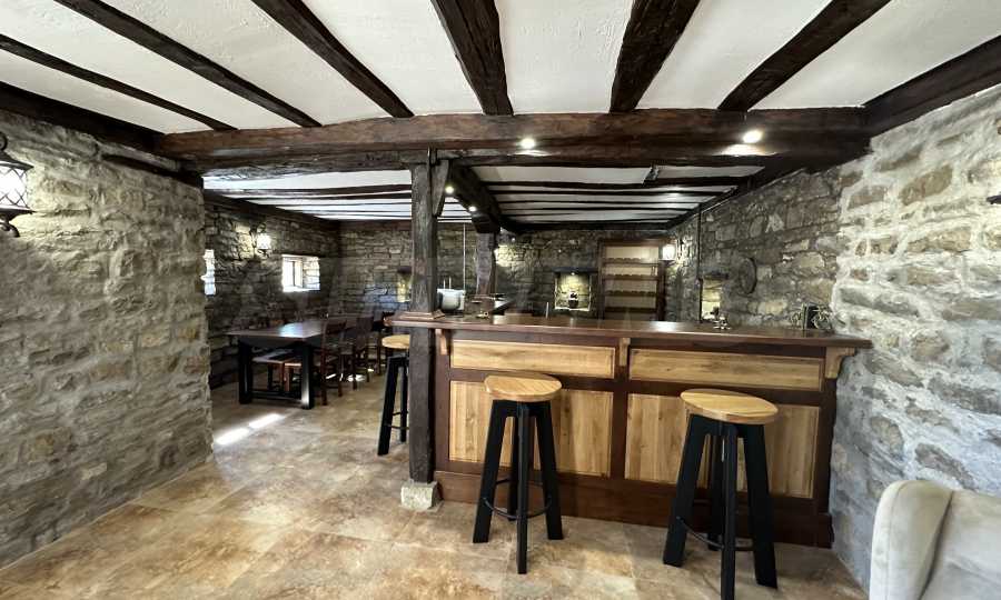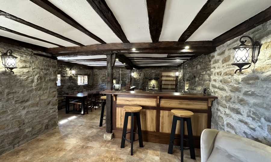The main half-timbered house has been renovated with modern insulation and PVC windows, while preserving its authentic spirit. On the first floor there is a large common room with a fully equipped kitchen, a dining room and a spacious tavern that also serves as a living room. External stairs lead to the second floor, where there are two large bedrooms and a modern bathroom with toilet.