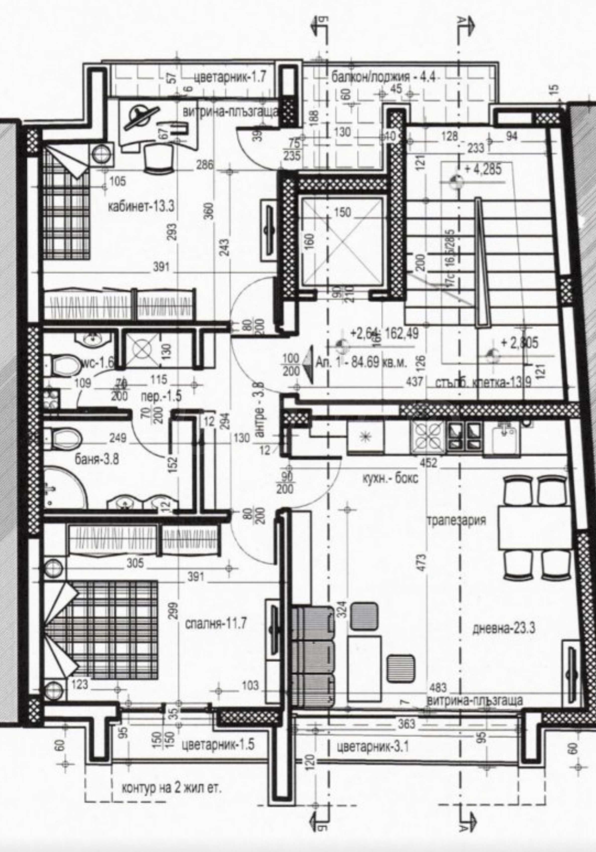 The apartment with a total area of 117 m2 is located on the 1st floor out of a total of 6 and has the following distribution: