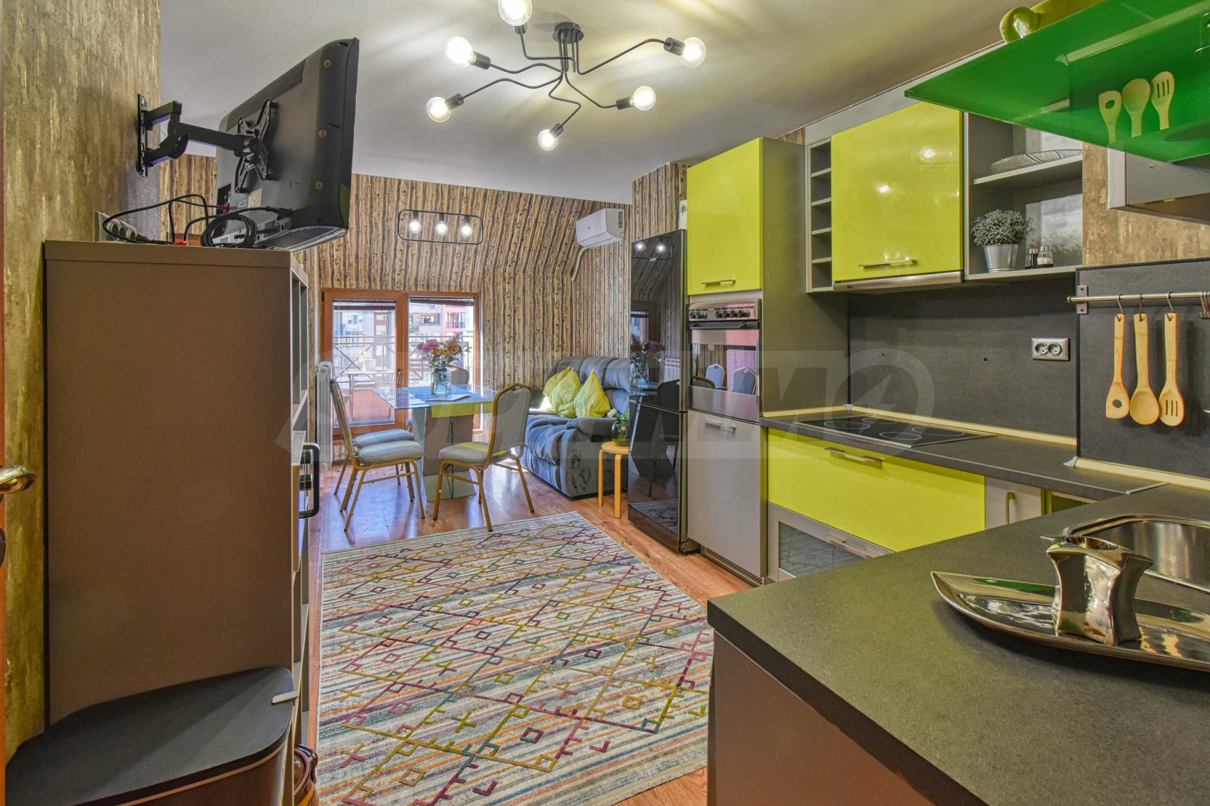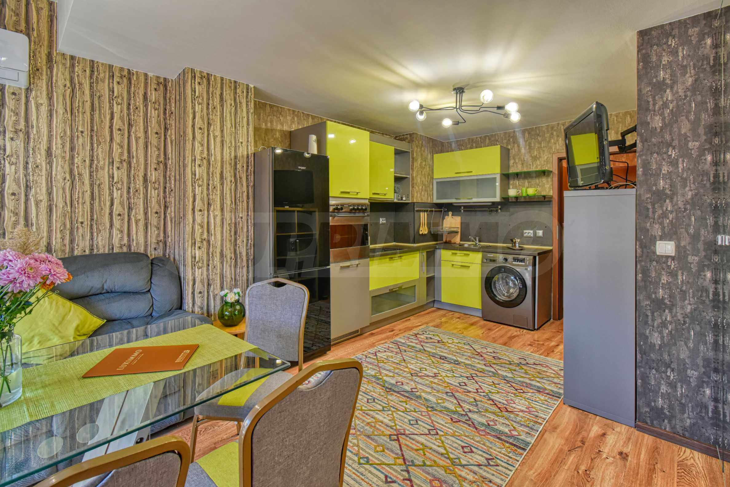 The apartment consists of a bright living room with a kitchenette, equipped with a full range of white goods: fridge with freezer, built-in oven with ceramic hobs (four), microwave oven, extractor hood, washing machine and clothes dryer. The living area has comfortable sofas, a TV corner, and a comfortable dining table.