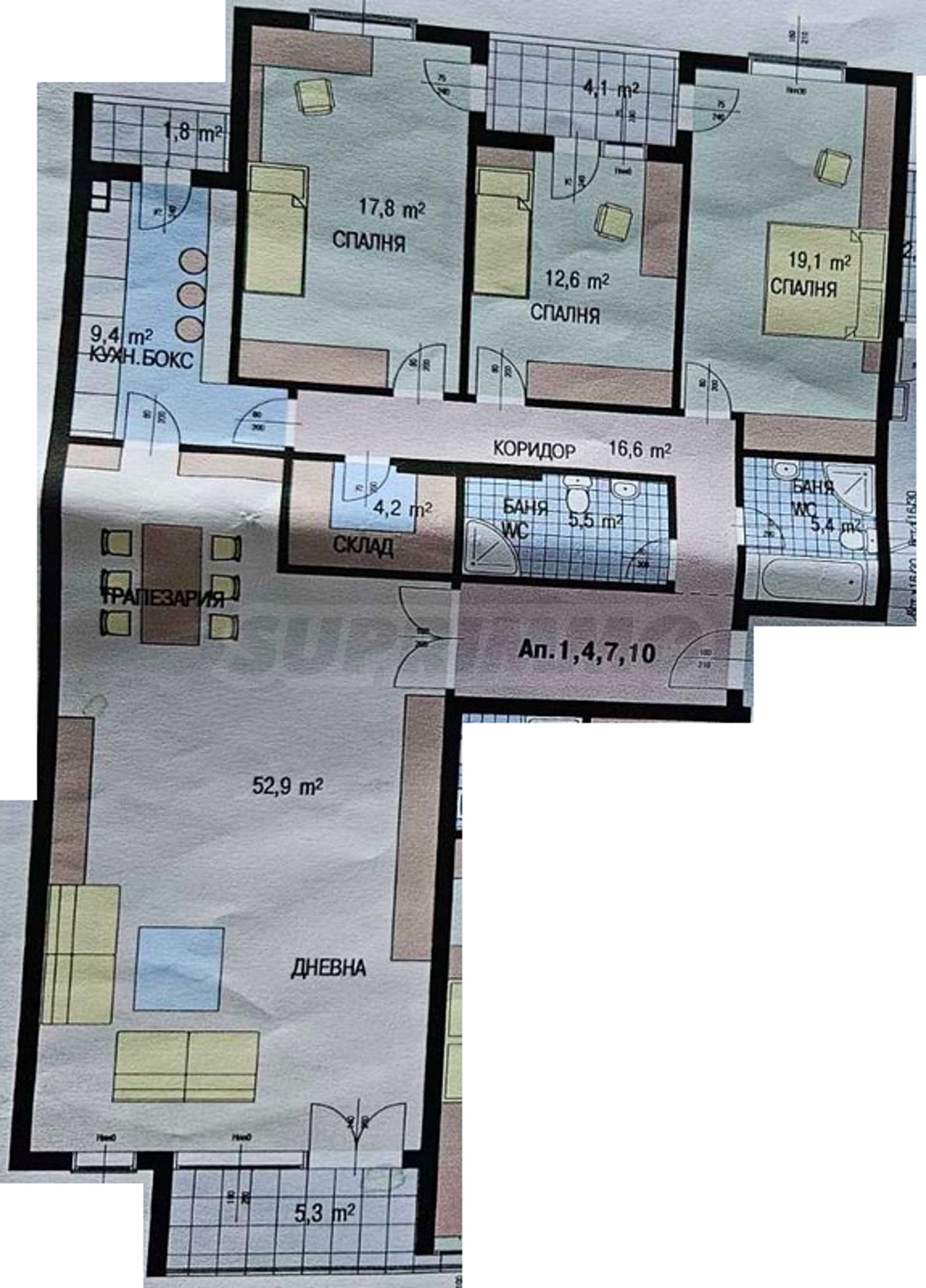 It has a large living room with dining area, covering an area of 52.9 sq m, suitable for family gatherings and relaxation, with its own terrace. The separate kitchen with an area of 9.4 sq m has its own small terrace. The three bedrooms have a shared balcony and are comfortable in size: bedroom 1 (19.1 sq m), bedroom 2 (12.6 sq m) and bedroom 3 (17.8 sq m).