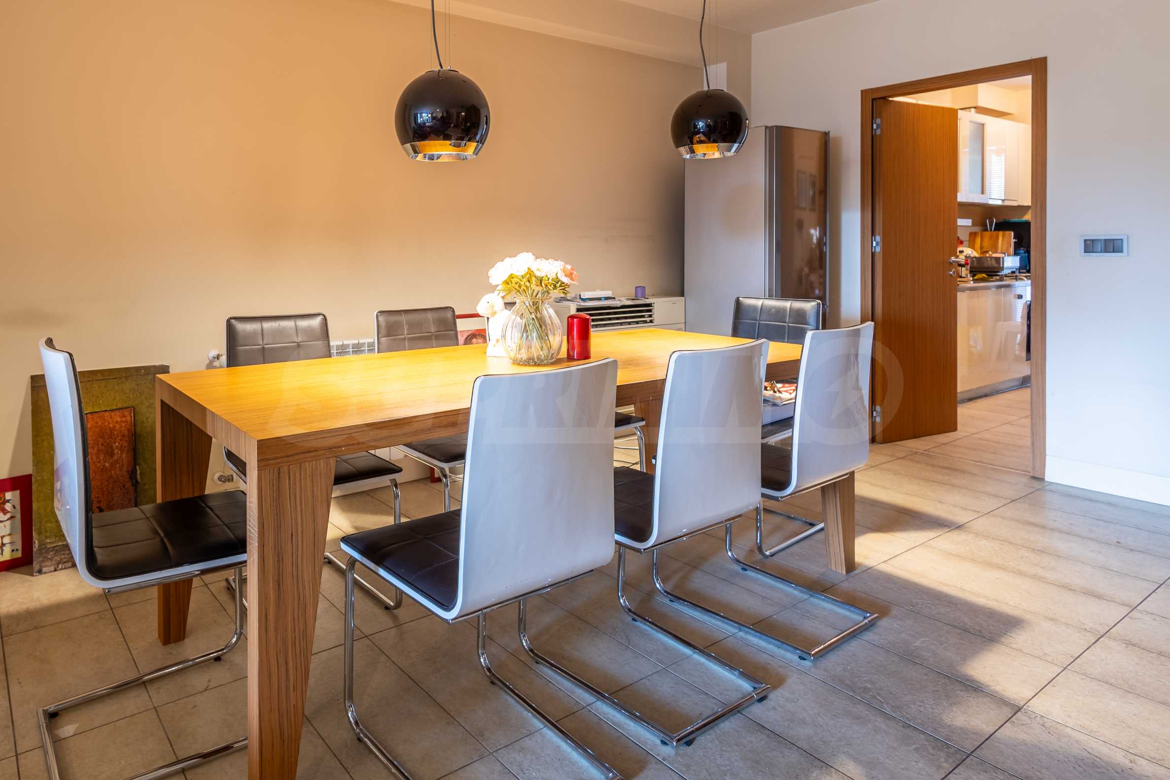 The living area impresses with its spaciousness, thanks to the large windows, modern lighting and comfortable furniture. Its terrace offers a pleasant view of the greenery of the trees. The dining room with a table for eight people and the modernly equipped kitchen offer ideal conditions for everyday comfort. The apartment has sturdy tiled floors, while the bedrooms have laminate flooring.