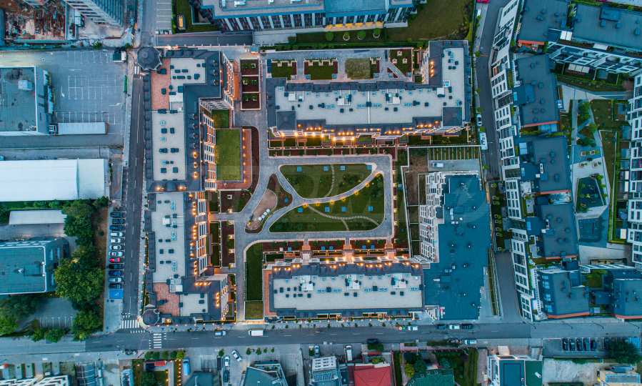 The complex (with a total area of 40,209 sq m) consists of five buildings. The four residential buildings ("A", "B", "C" and "D") are located on the periphery of the terrain, forming a common inner-neighborhood space, which is separated as a park, designed with care for the residents and their children. A balance between greenery, rest areas and alleys provide a place for complete relaxation, and in the center of the complex it is planned to build a playground for children from 2 to 13 years old.