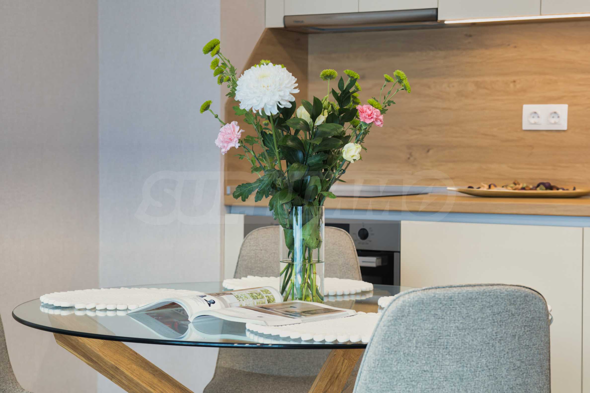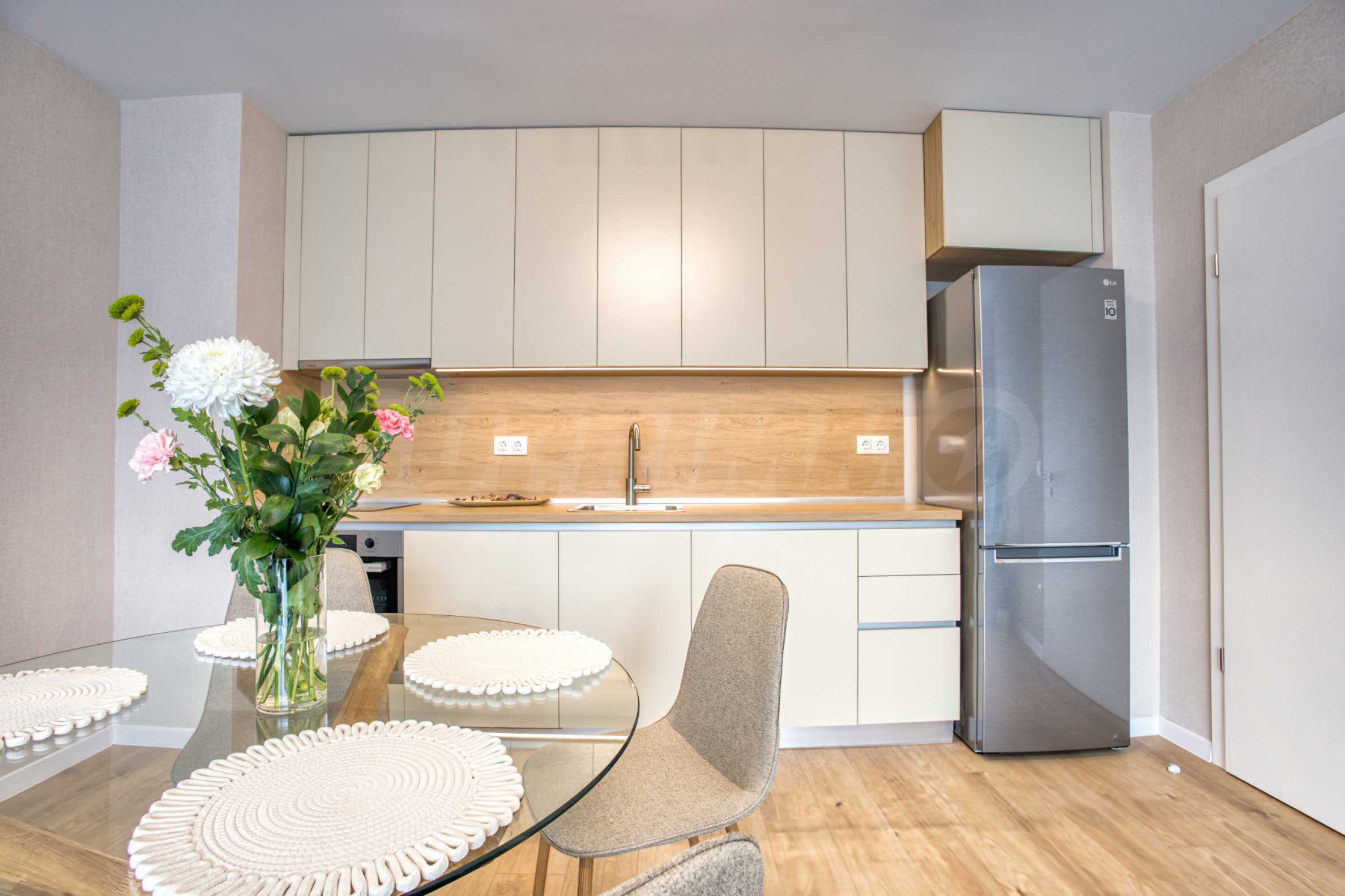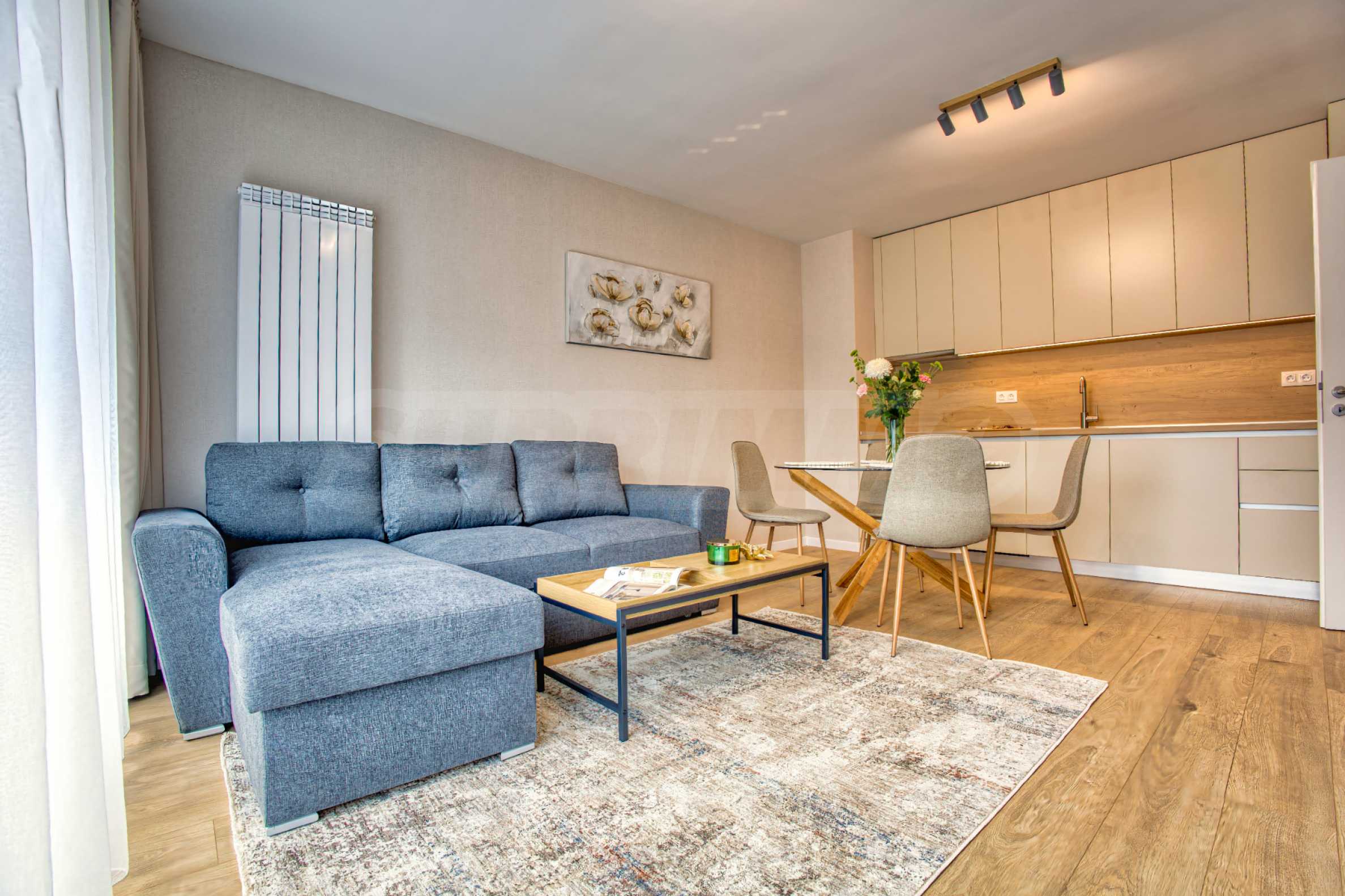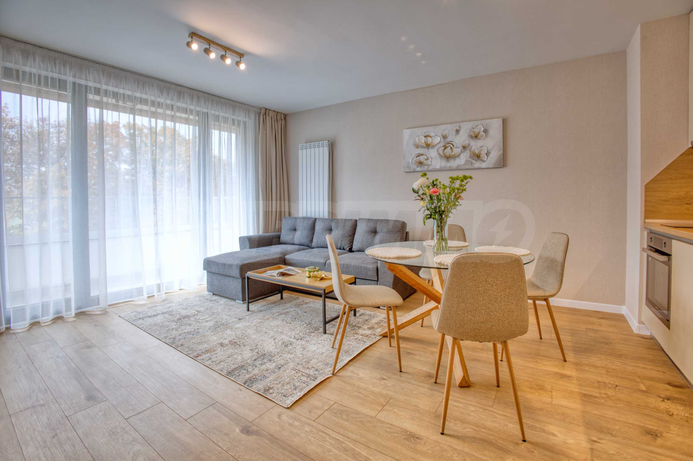 Living room with kitchenette - furnished with a stylish sofa, dining table and TV, and the kitchen has all high-end appliances: refrigerator, oven, ceramic hobs, extractor hood and washing machine;