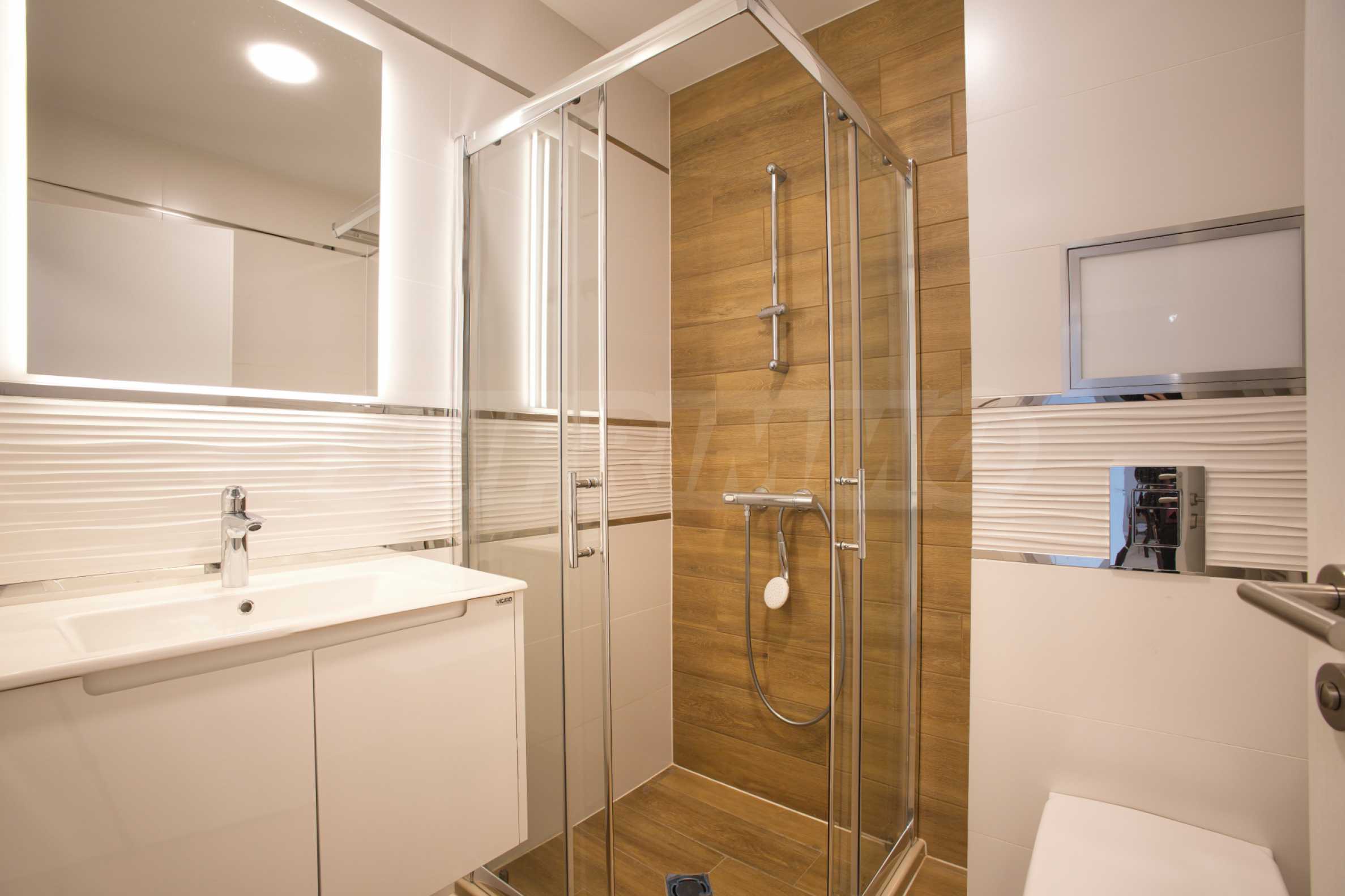 Bathroom with toilet - elegantly decorated with quality materials, including a shower cabin and comfortable furniture;