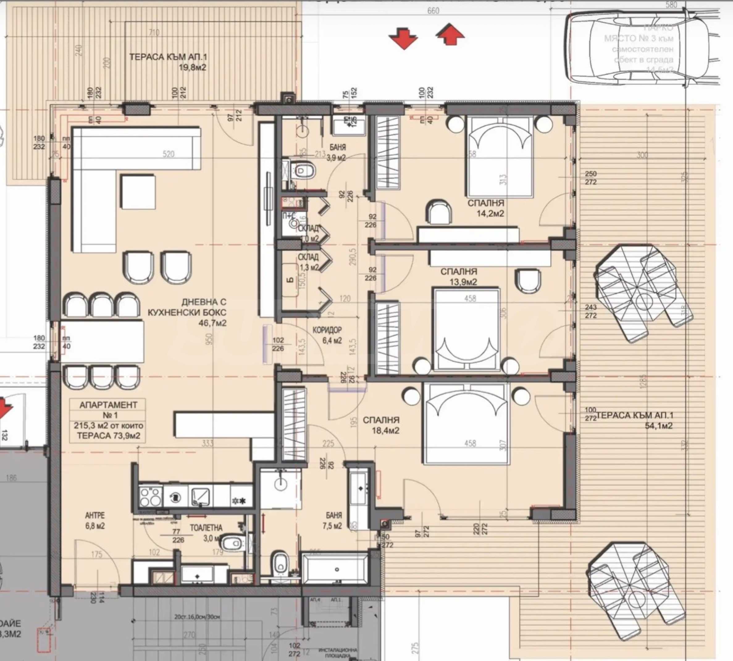 The apartment has an area of 182.43 sq m + terrace 73.90 sq m and has the following distribution: