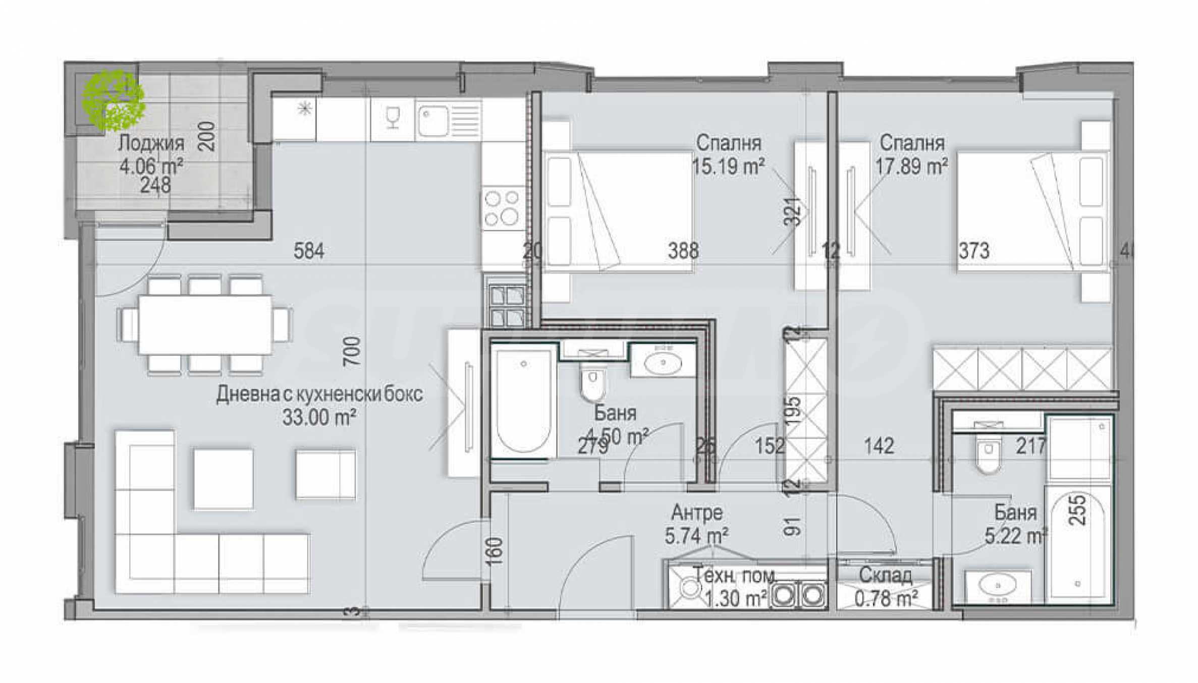 - two bedrooms - 15.19 and 17.89 sq m, one with its own bathroom/toilet and storage room.