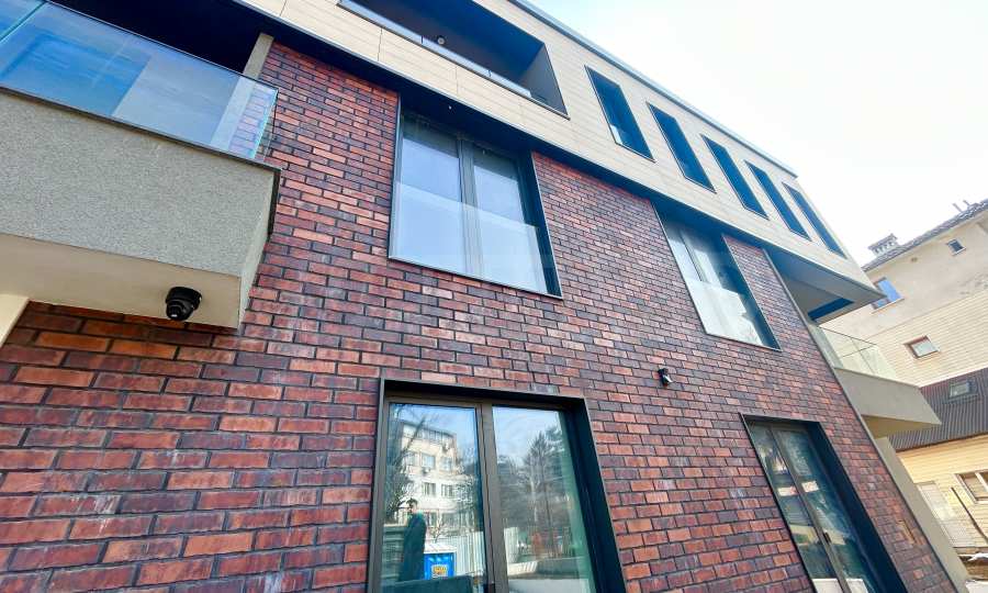The building has a modern look, divided into two visual elements in height. The first and second floors form the base, on which the third floor stands out with individual style and elegance. The facade is clad with high-quality materials that provide excellent energy efficiency. The design combines a brick look and stone cladding for aesthetics and sustainability.