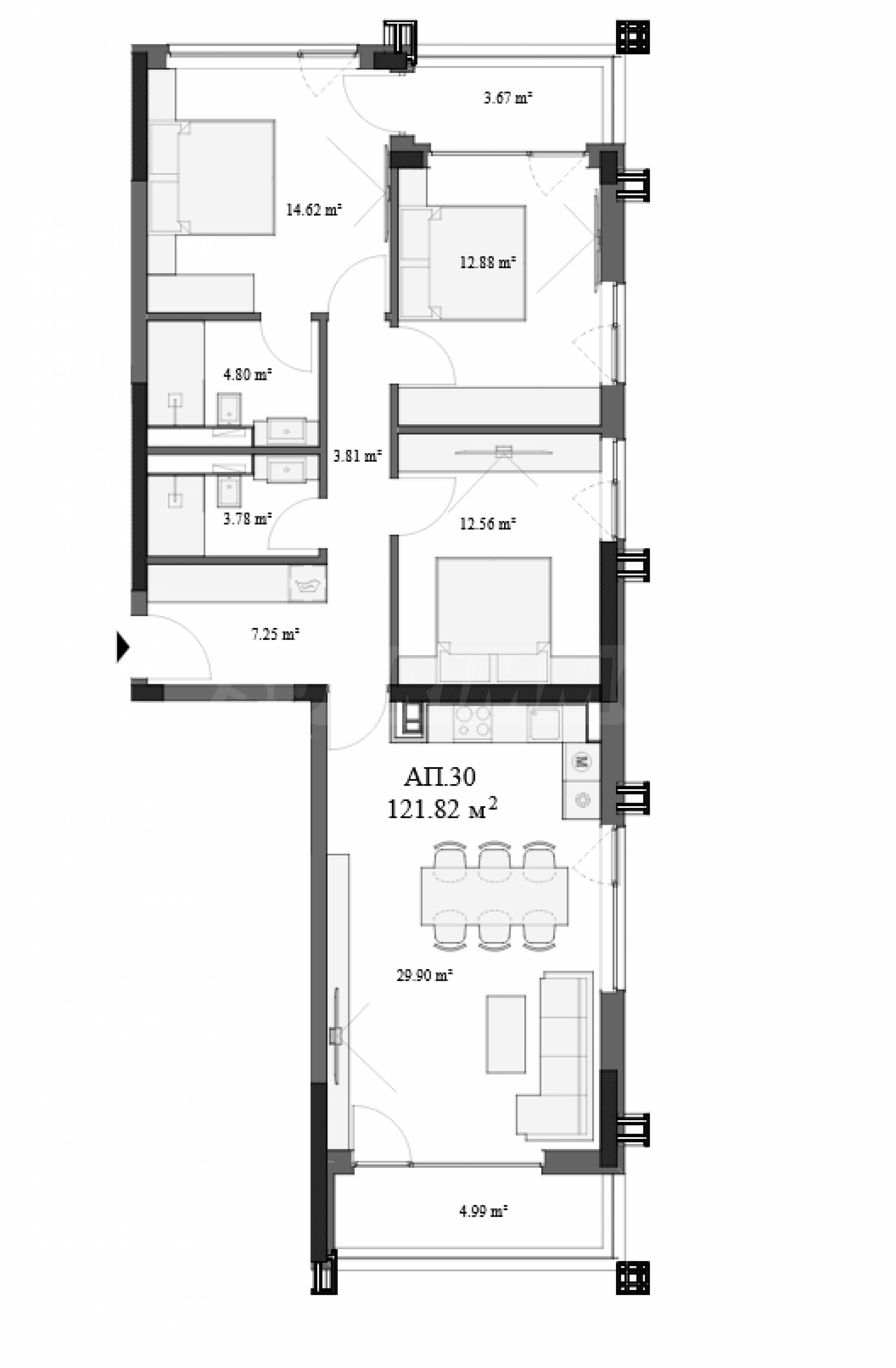 The apartment has a total area of 149.03 m2., is located on the sixth floor of an 11-story building and has the following layout: