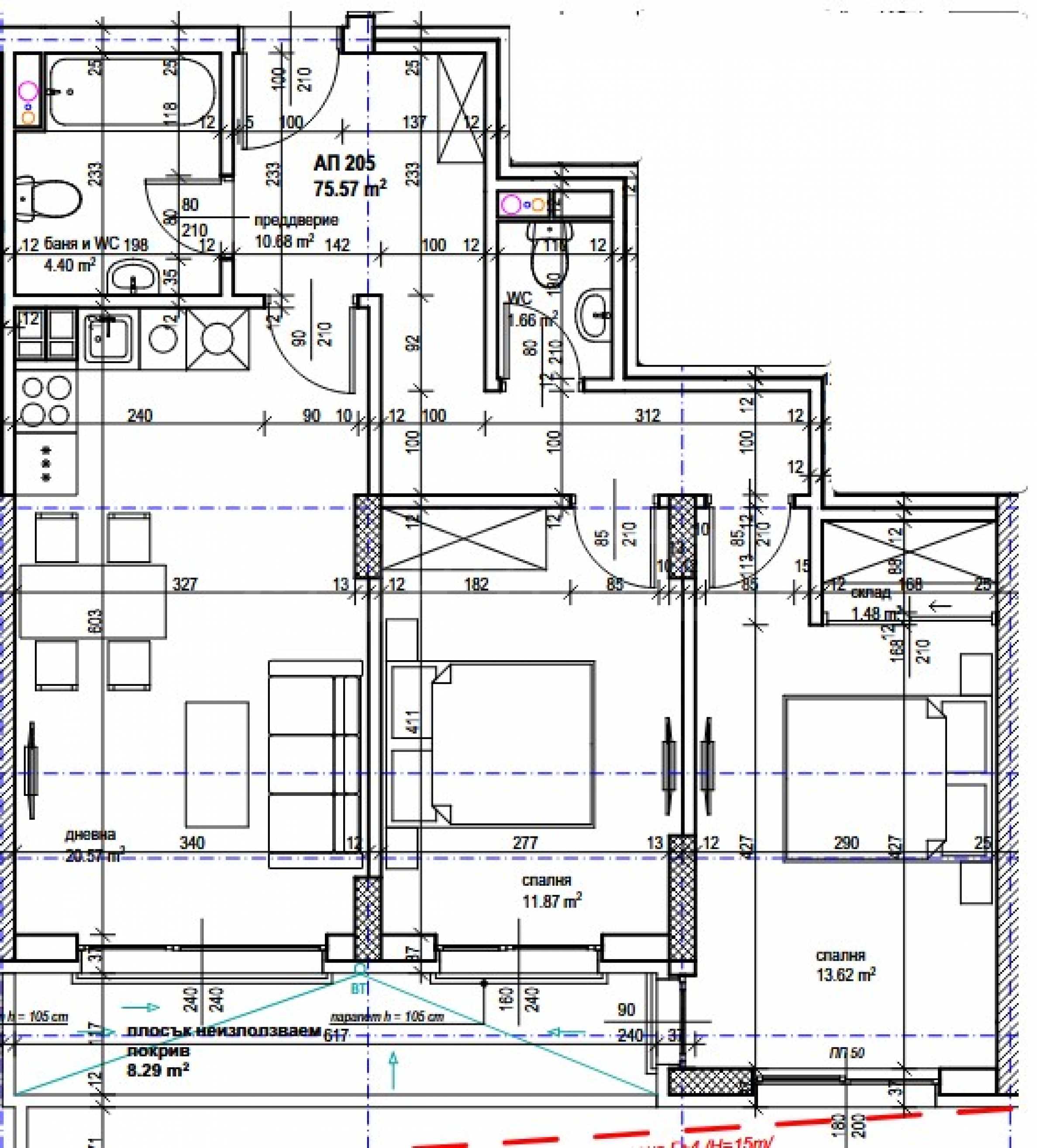 - flat roof with layers laid in detail - vapor barrier, thermal insulation from extruded polystyrene foam - XPS, reinforced screed with a slope, two layers of rolled bitumen waterproofing; without thermal bridges on the structural elements;