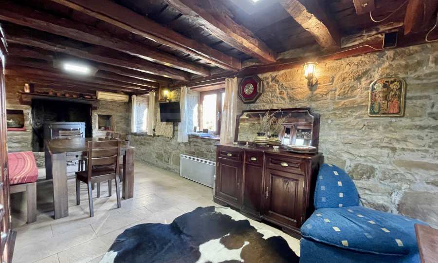The house is built of stone and old oak beams, and the roof is made of traditional stone slabs.
