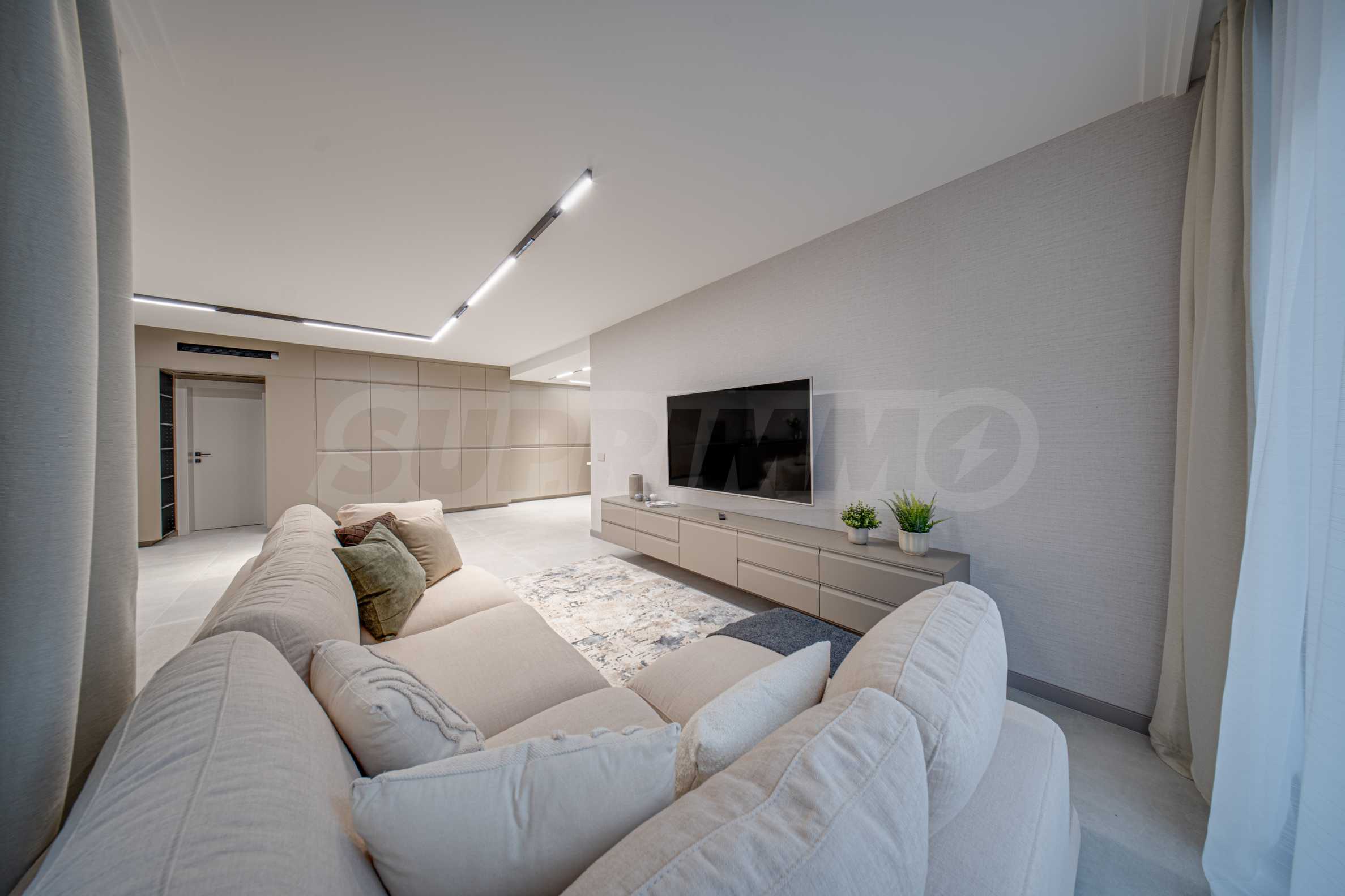 • Corner with sofas and a Sony 65” TV.