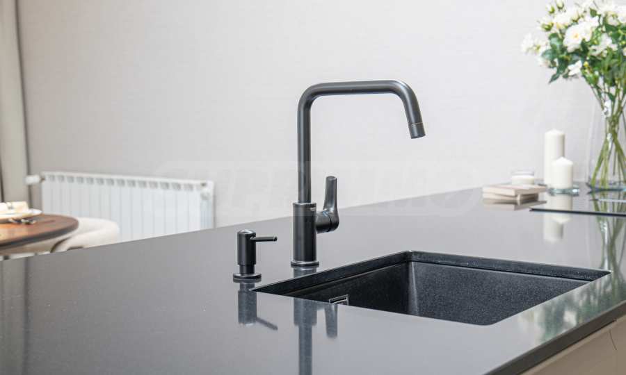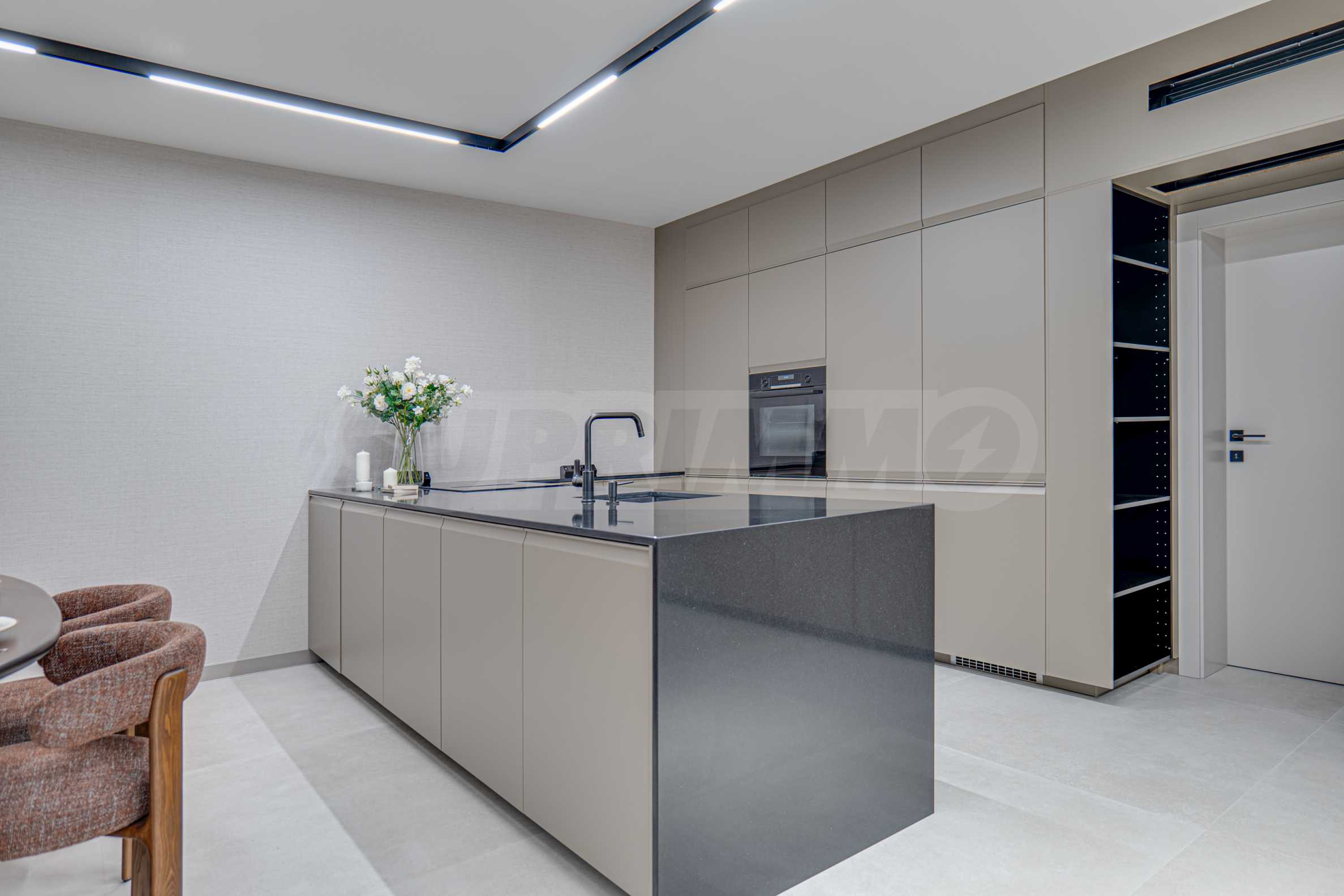 • Kitchen island made of engineered stone with Bosch glass ceramic hob with built-in extractor hood and built-in Bosch dishwasher.