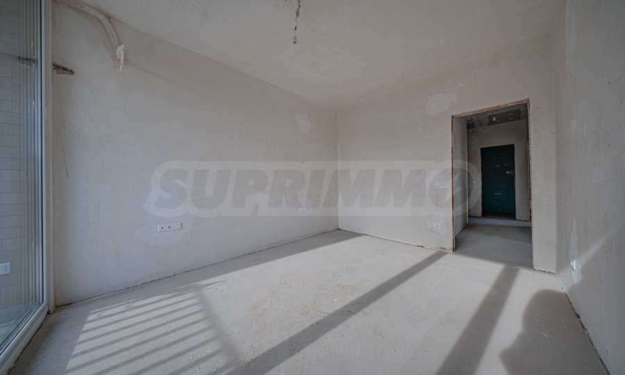The apartment is located on the 3rd floor, with a favorable east/south exposure and has a total area of 120.67 sq m. It consists of an entrance hall, two bathrooms with toilets, two bedrooms, a living room with a kitchen, a loggia-type terrace, with access from the living room and one of the bedrooms, with a view of the mountains.