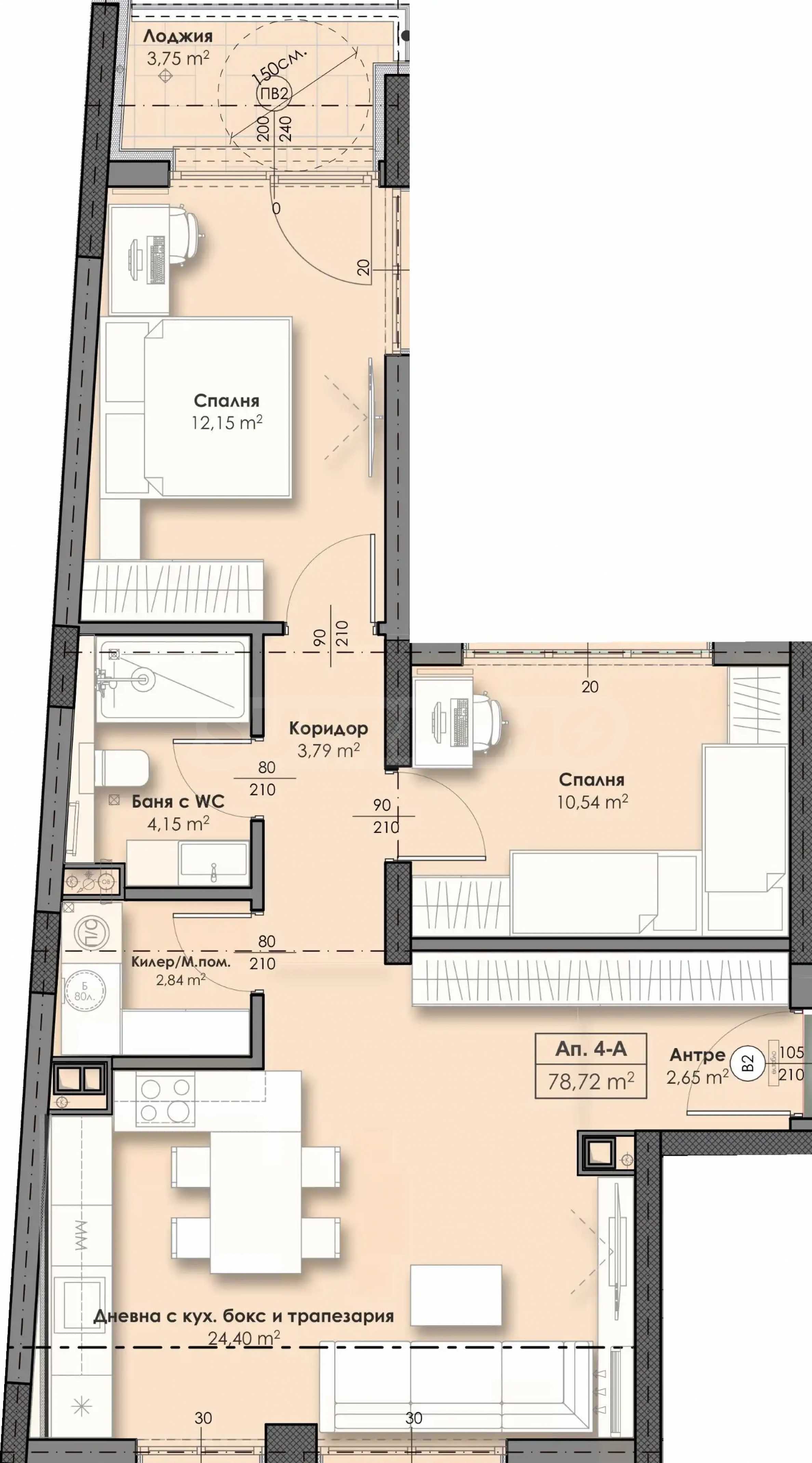 The apartment is located on the 2nd floor of 9 and has a total area of 95.79 sq m. It is being sold with high-quality finishing according to Bulgarian Standards (on putty and screed).