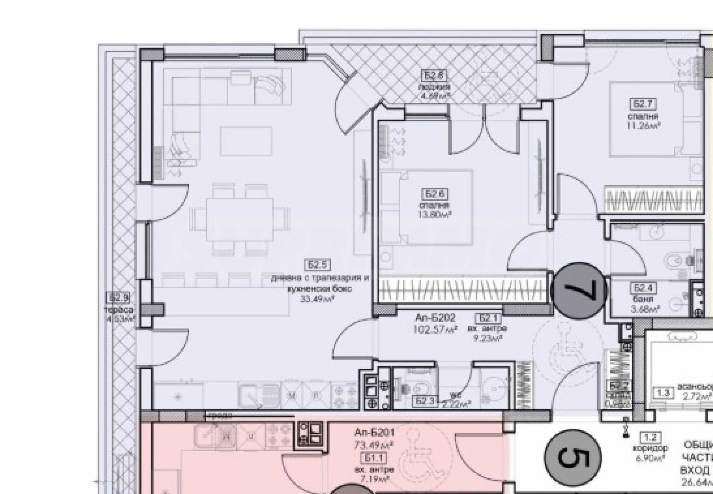 Three-bedroom apartment with a living area of 102.57 m2.