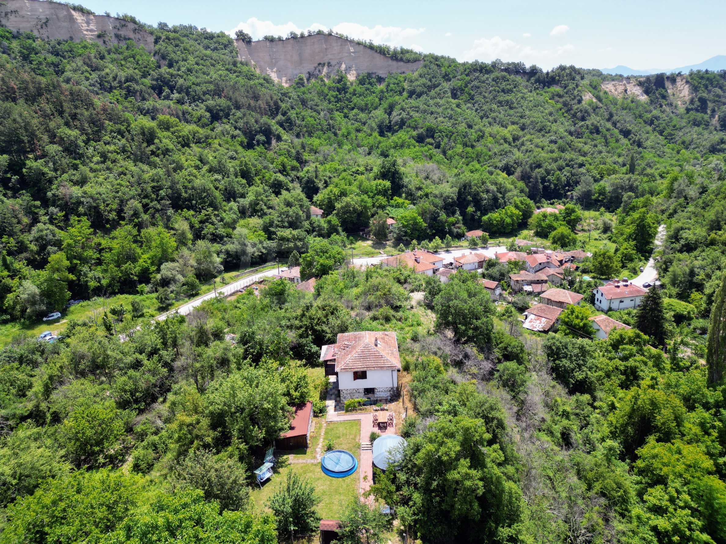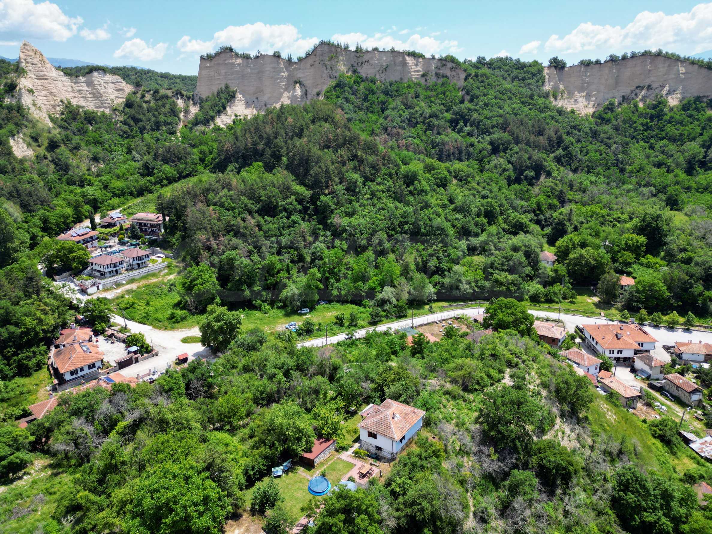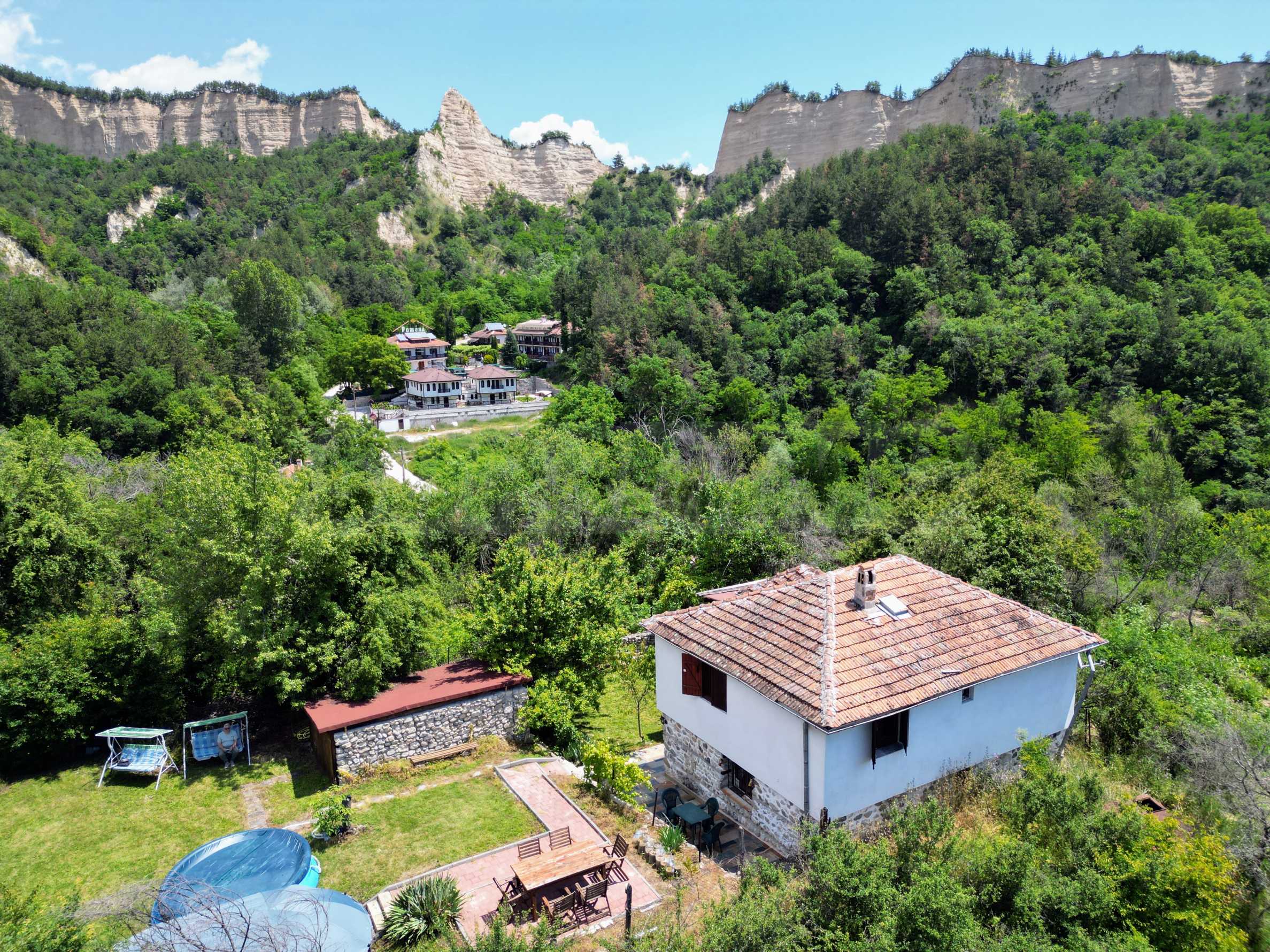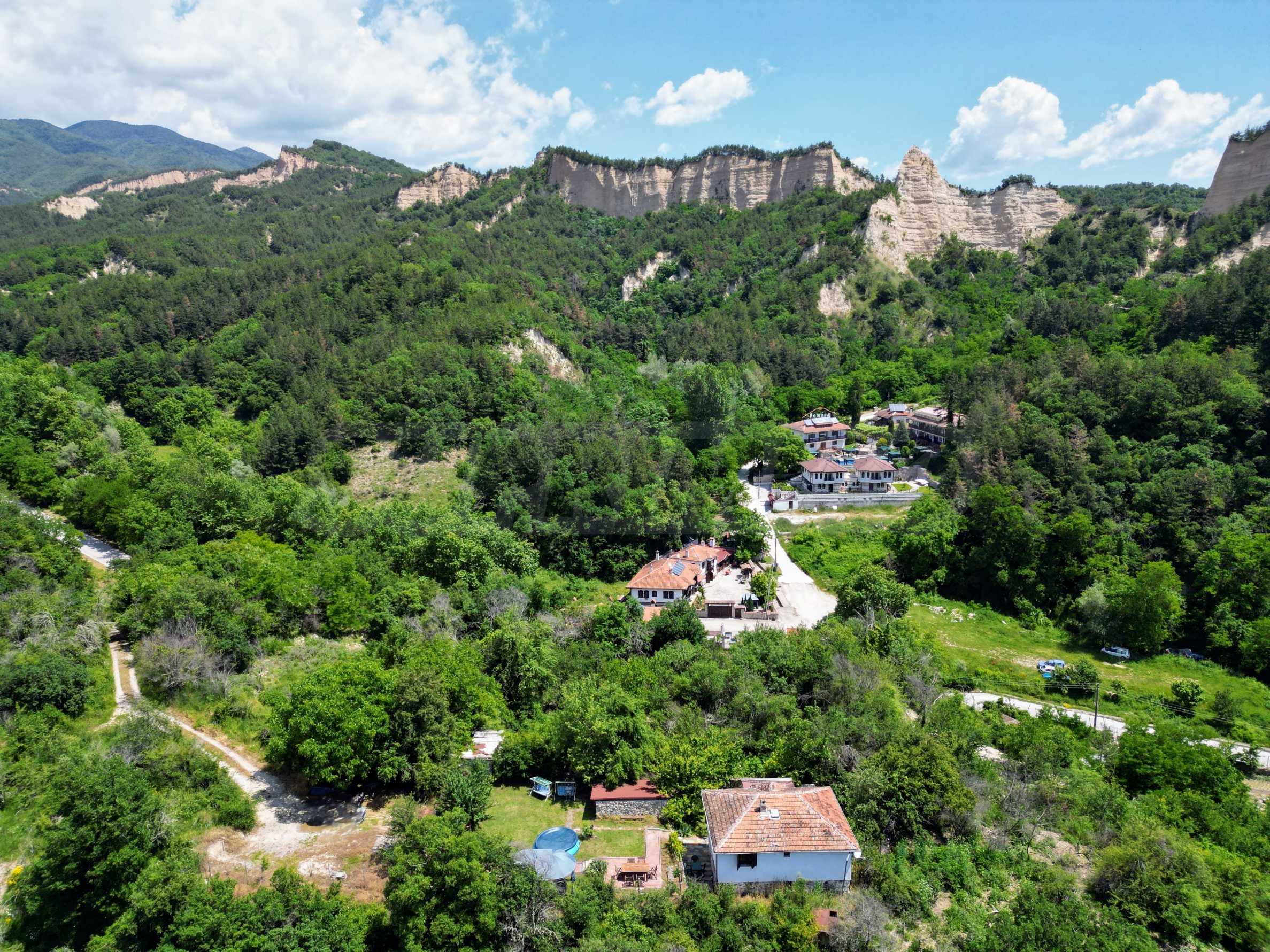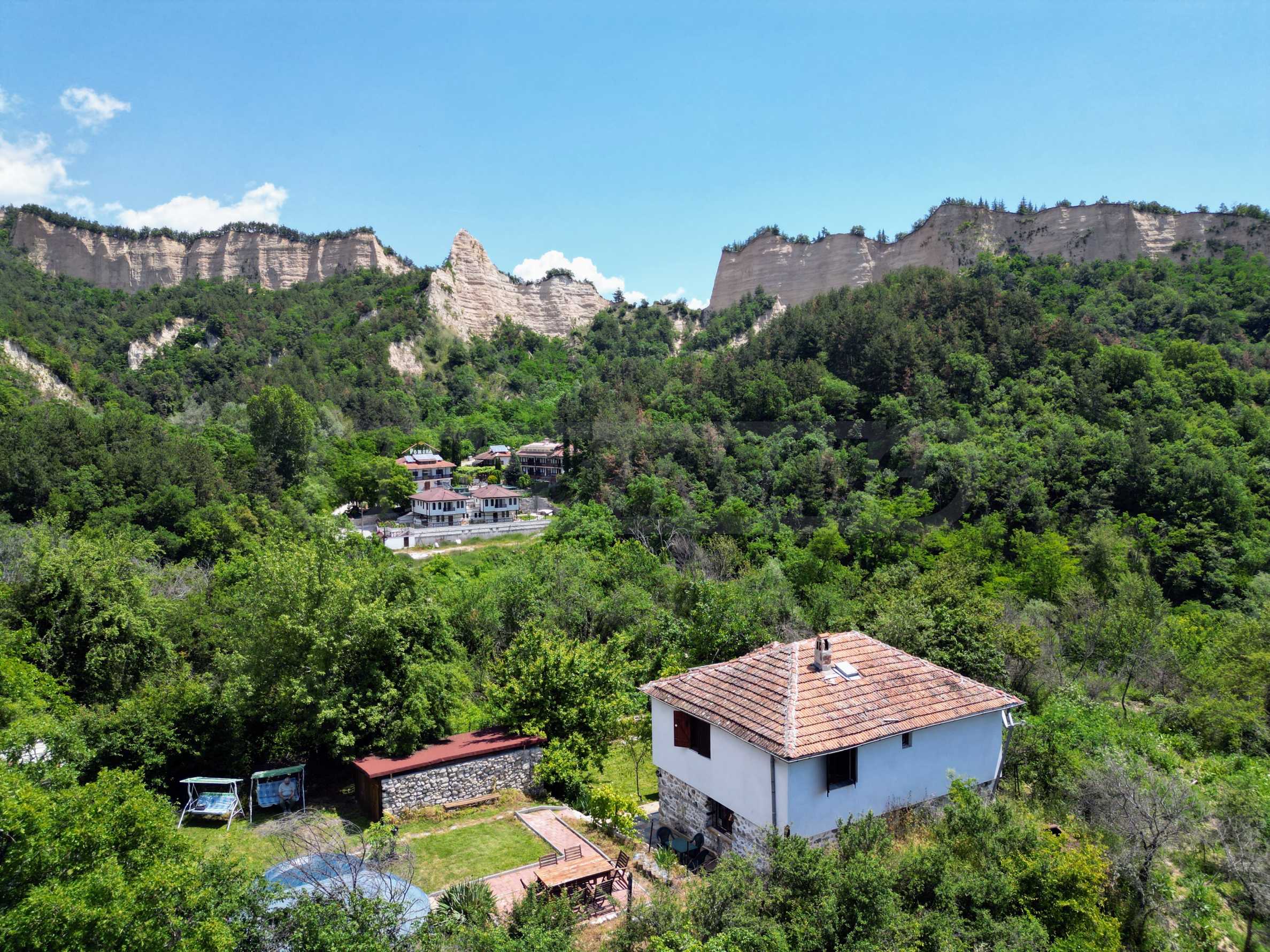 We present a wonderful property in the heart of nature – a two-story house in authentic style and modern first-class amenities, located in the village of Rozhen, in close proximity to the Rozhen Monastery. Its biggest advantage is the unique location – independently located on a hill, without neighbors and prying eyes, with panoramic views of the Melnik Pyramids and the majestic Pirin Mountain.