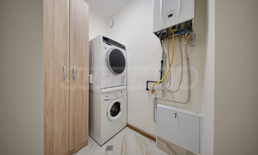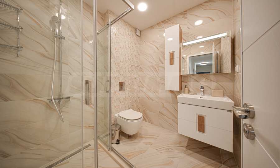 Furnished with modern furniture and appliances, the property offers a bright, first-class and functional interior. There is everything you need for living: a refrigerator, oven, hobs, dishwasher in the kitchen, a washing machine in the bathroom. The bedrooms have beds, wardrobes and bedside tables, and in the living room - a comfortable sofa and a TV.