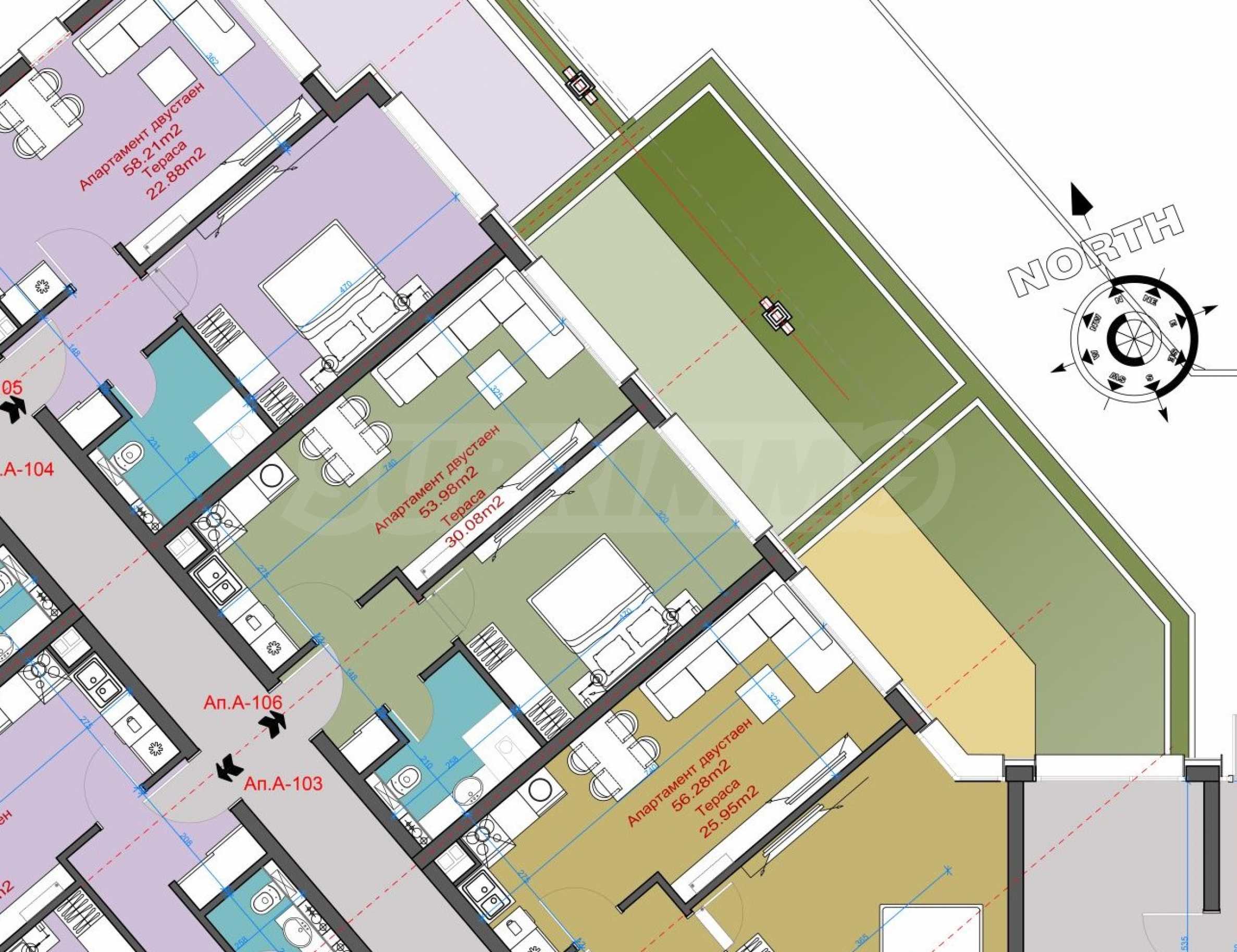 The upcoming new building offers an attractive contemporary ventilated facade with HPL, in the traditional colors of the complex, is distributed over 5 floors with two entrances - "A" and "B", with a modern elevator. It offers a choice of spacious studios, one-bedroom and two-bedroom apartments.