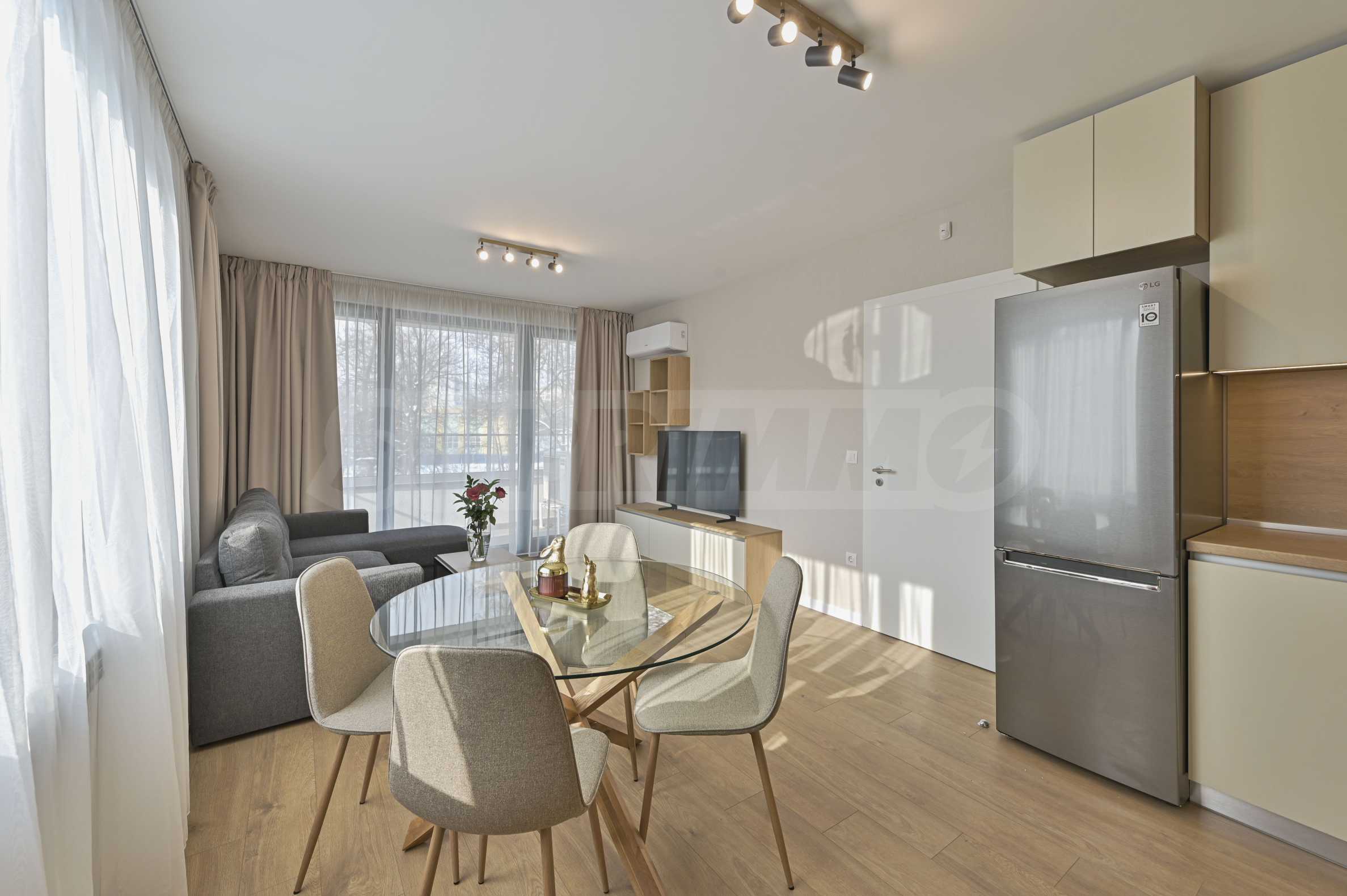 Living room with kitchenette - furnished with a stylish sofa, dining table and TV, and the kitchen has all high-end appliances: refrigerator, oven, ceramic hobs, extractor hood and washing machine;