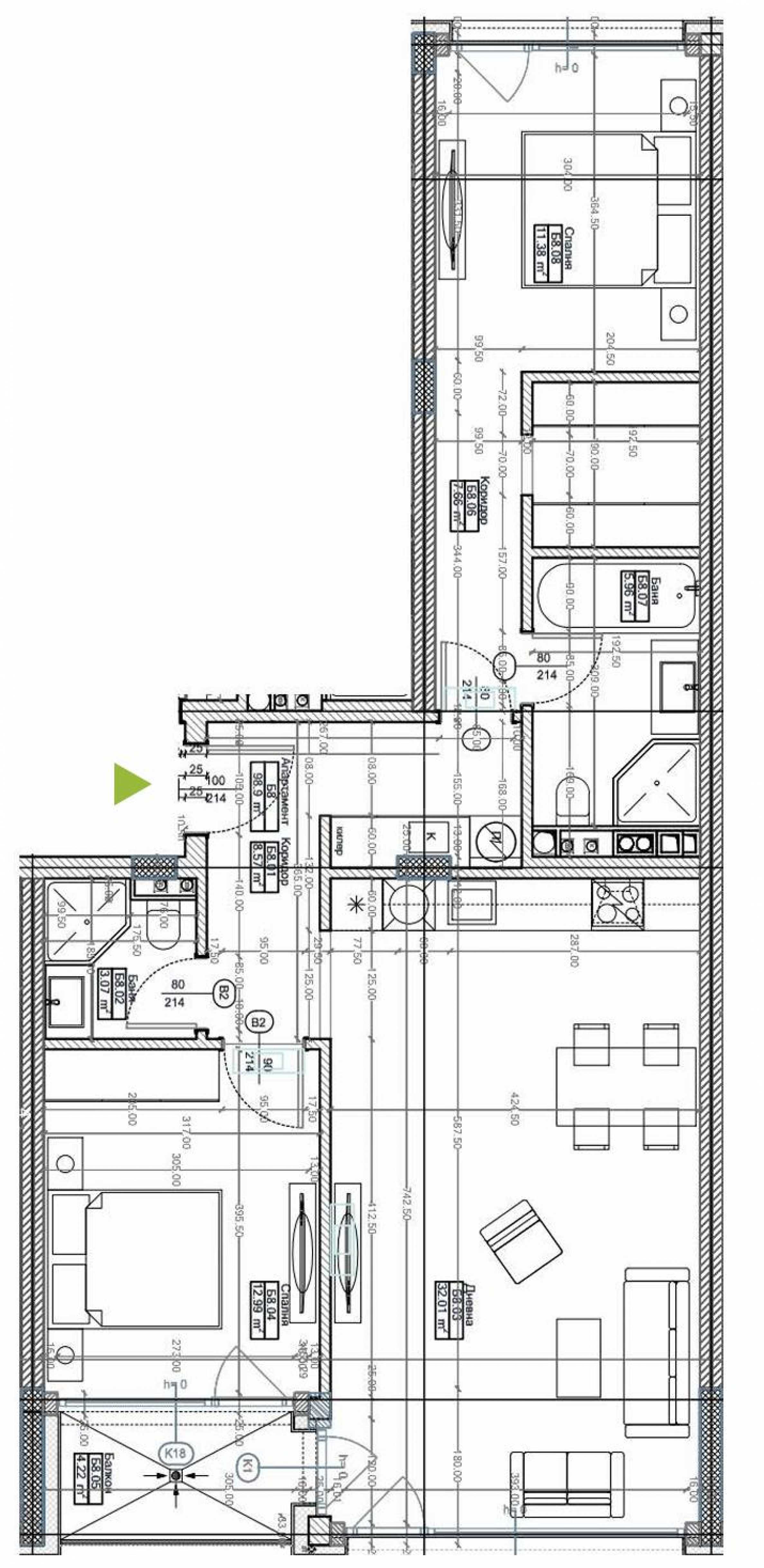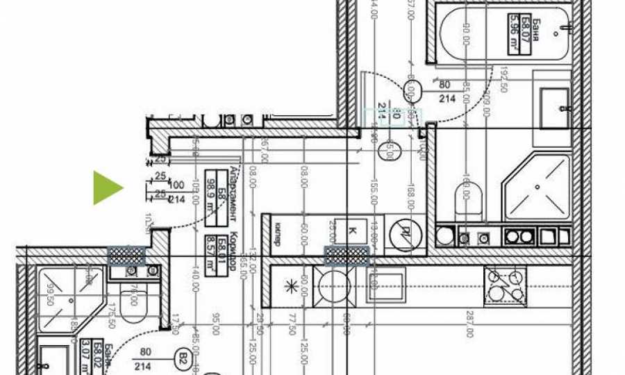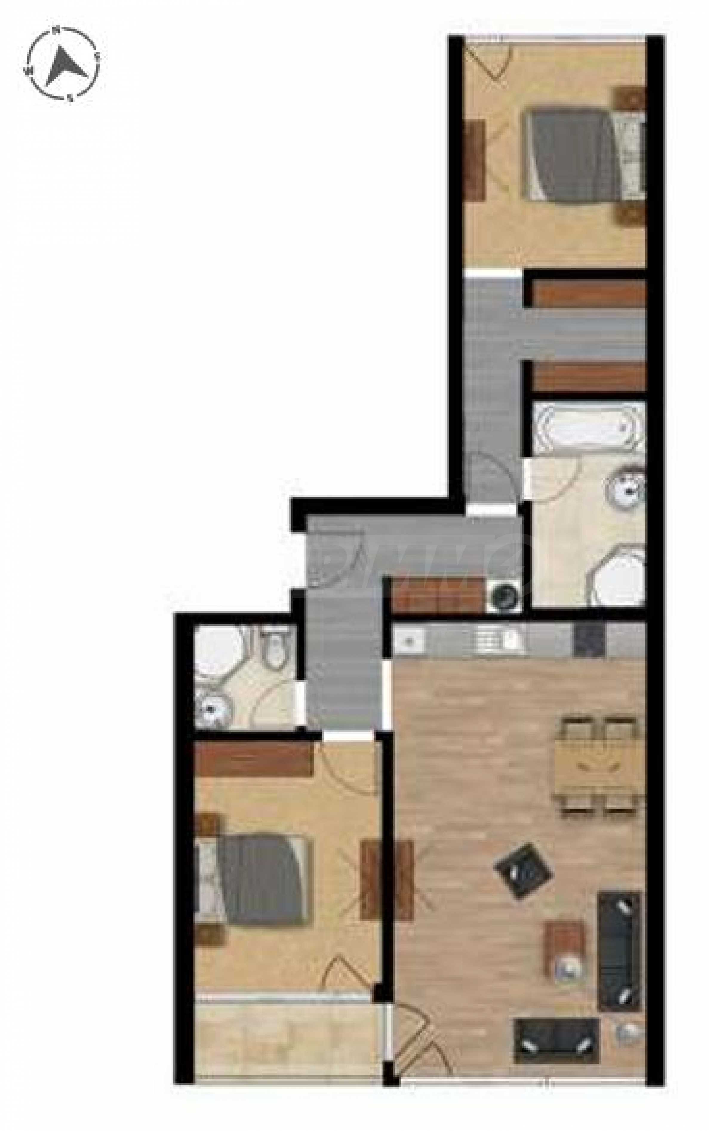 The apartment has two bedrooms, is located on the third floor with a southern exposure of the living room and one bedroom, as well as a view of the inner courtyard of the complex. The apartment has a total area of 99 sq. m., functionally distributed between: