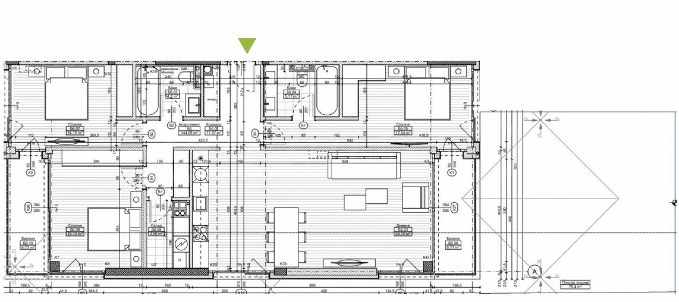 The apartment has three bedrooms, is located on the second floor with a south/west/north exposure and a view of the inner courtyard of the complex and the extension of South Park. The apartment has a total area of 144 sq. m., functionally distributed between: