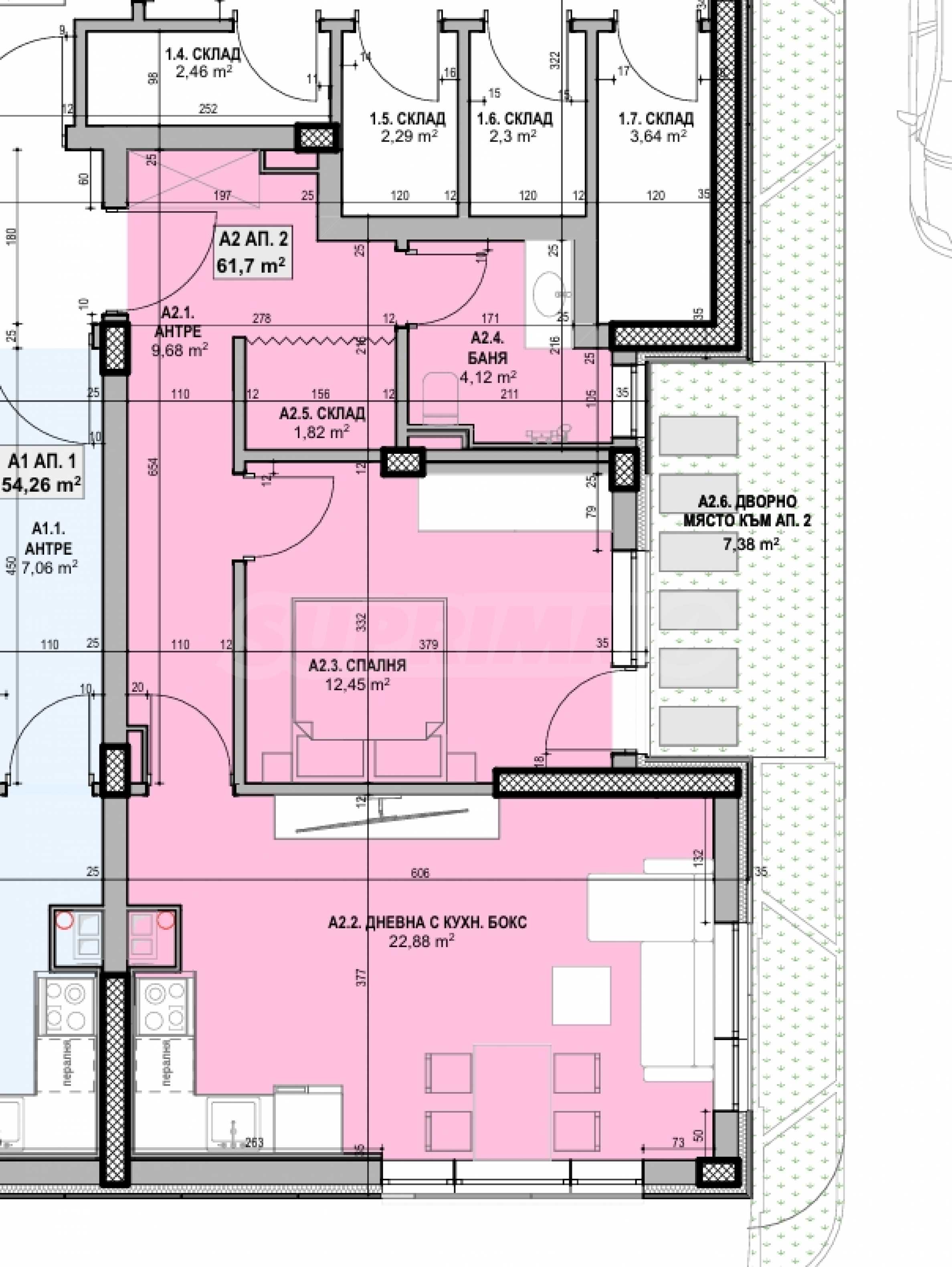 The apartment is located on the ground floor and has a built-up area of 61.7 sq m, with a favorable south/east exposure.