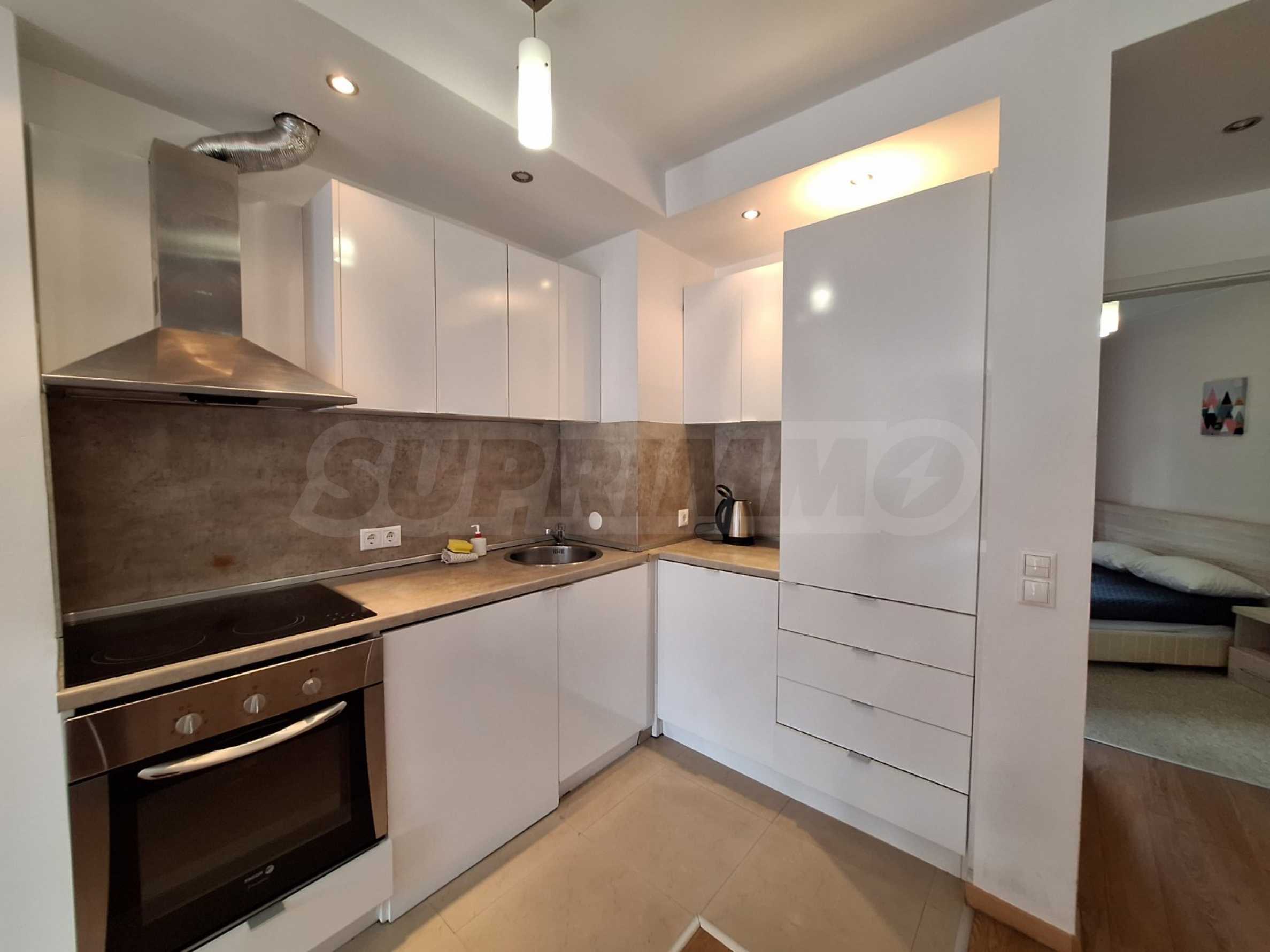 The apartment is individually designed, with great attention to detail. Only the highest quality and natural materials were used in the decoration. The spacious living room has upholstered furniture and a white kitchen, which is fully equipped with high-end appliances: oven, hob and refrigerator.