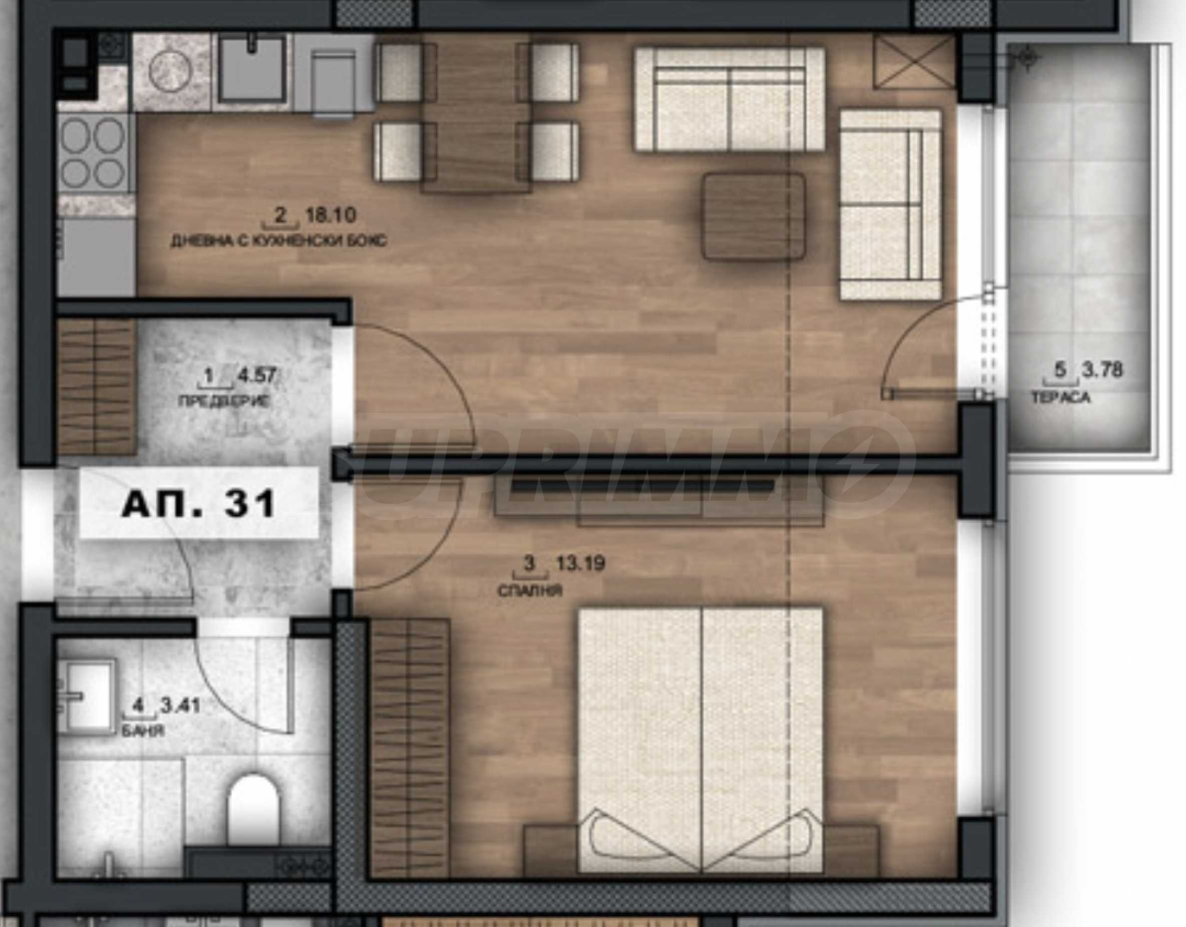 - spacious living room with kitchen - 18.10 sq m, with access to a terrace of 3.78 sq m;