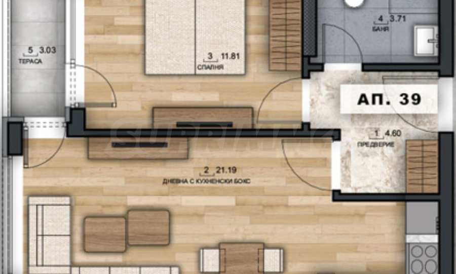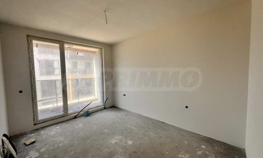 The property is located on the 3rd floor of 6 and has a western exposure. The apartment has a total area of 63.12 m2, built-up area of 52.16 m2. It is sold in a state of completion according to Bulgarian Standards, with quality Aluplast joinery, heating is provided by gas or air conditioners.