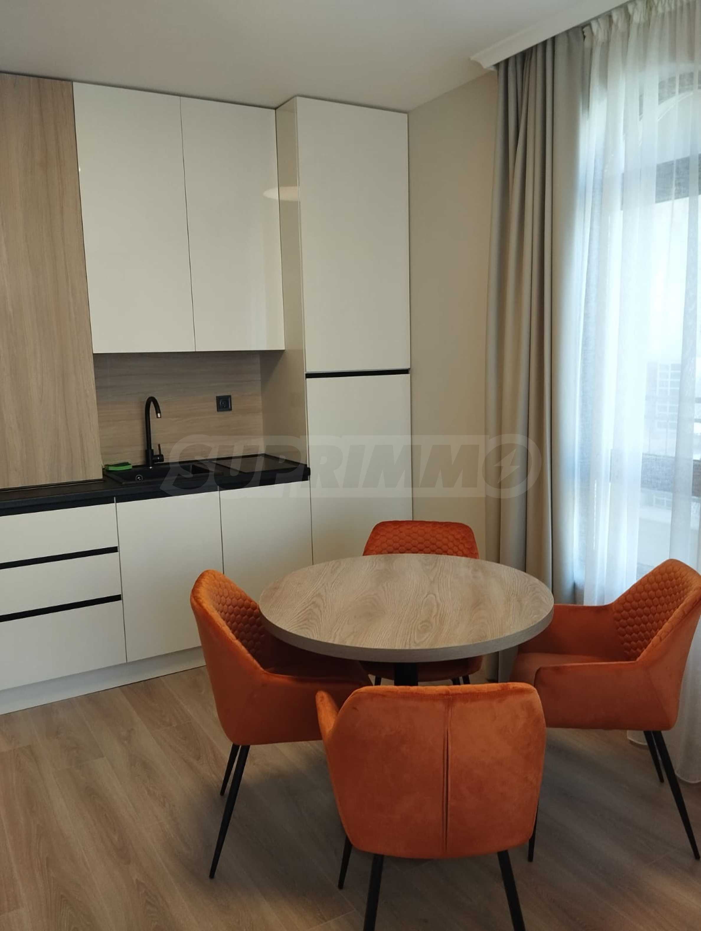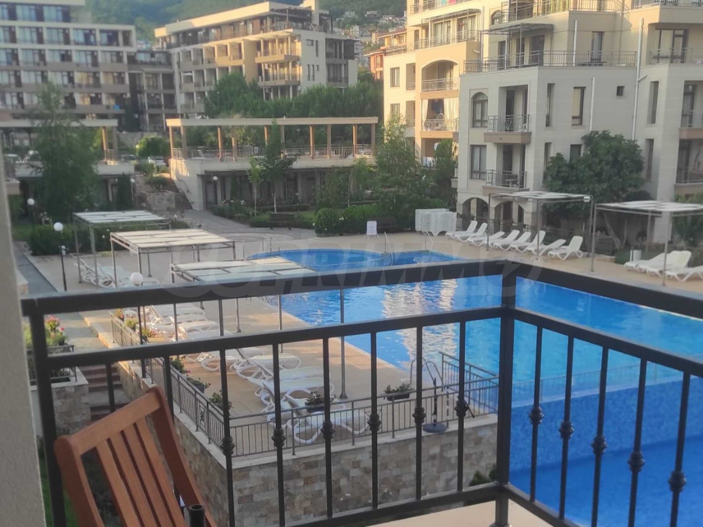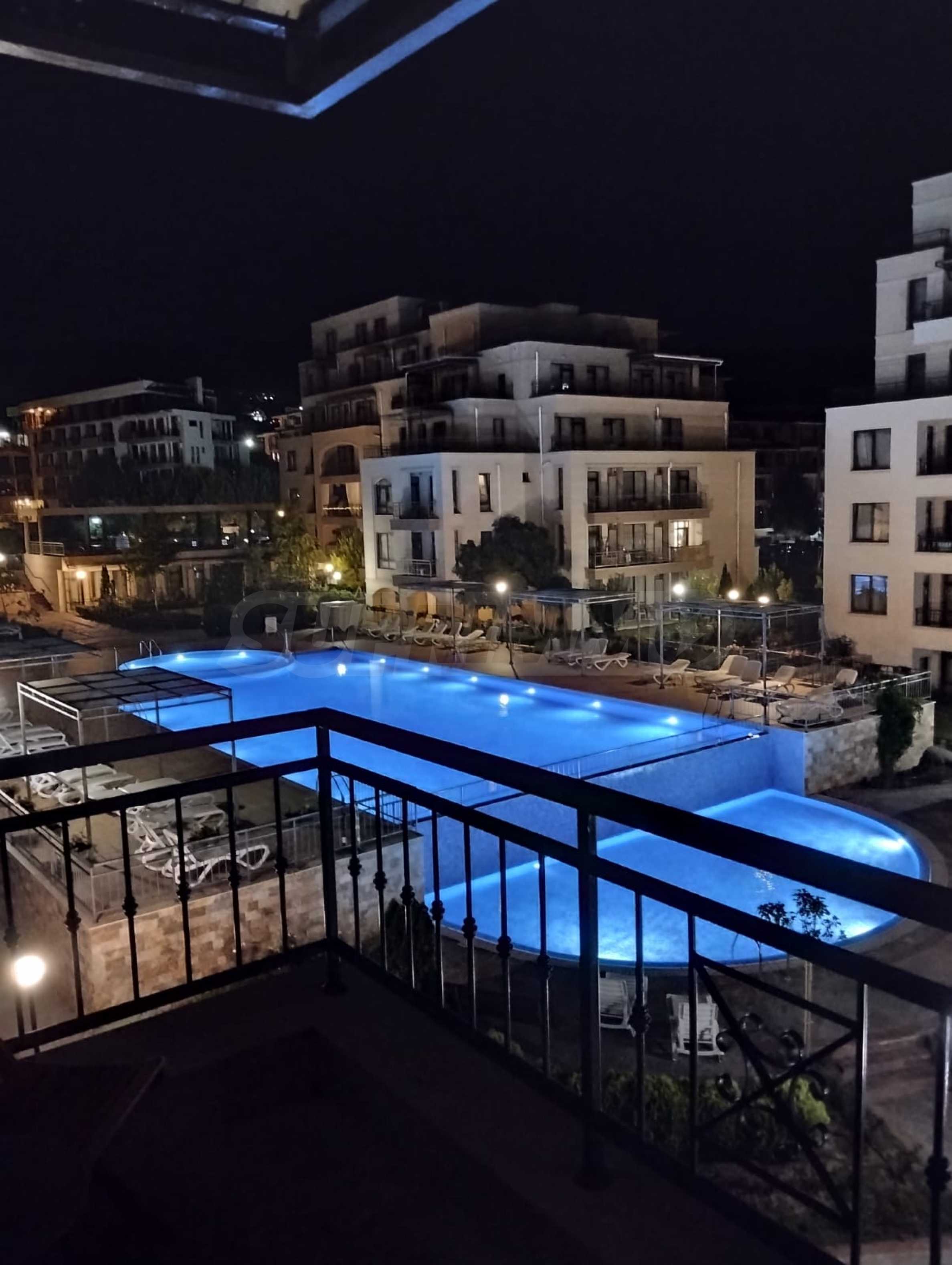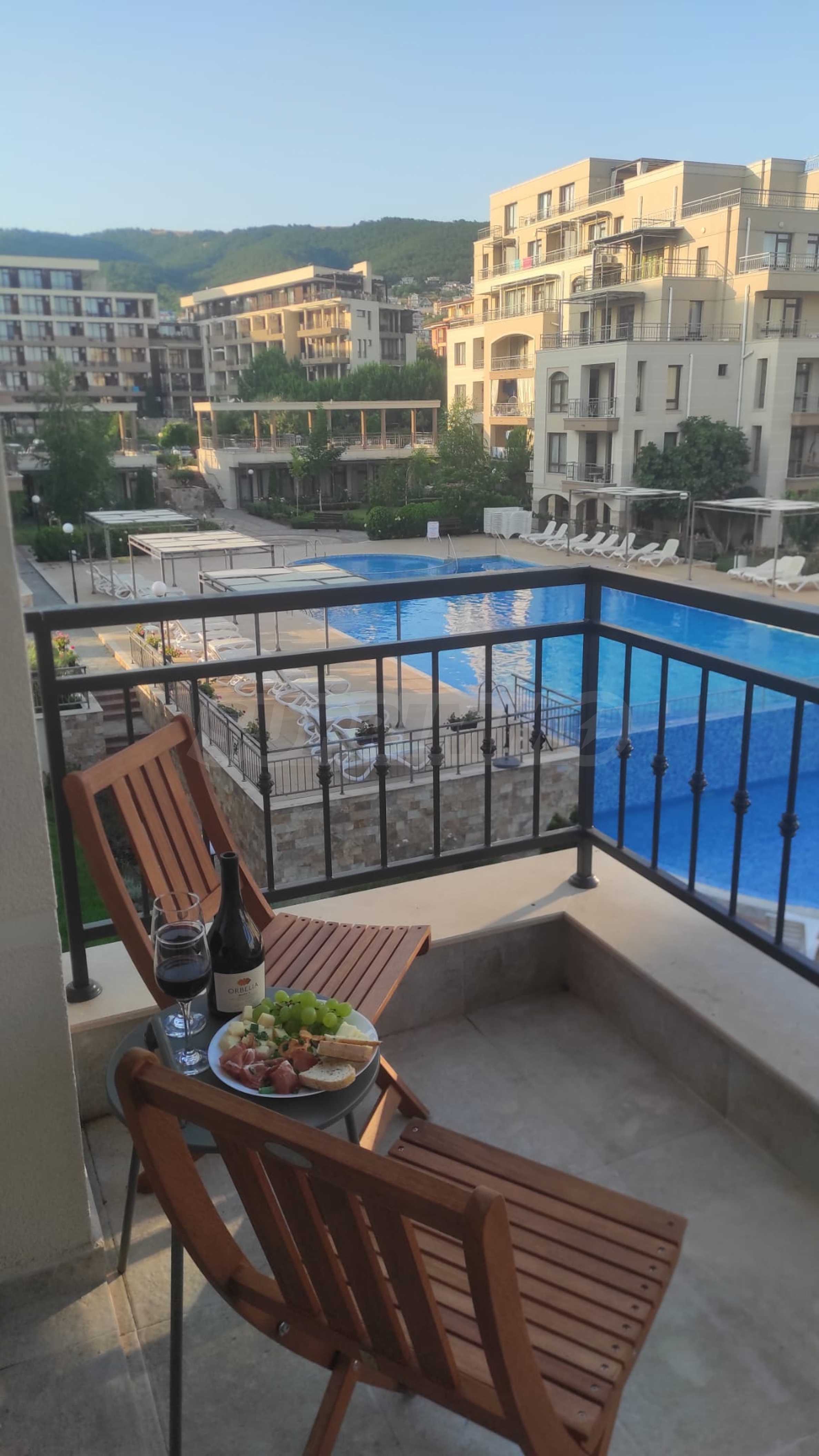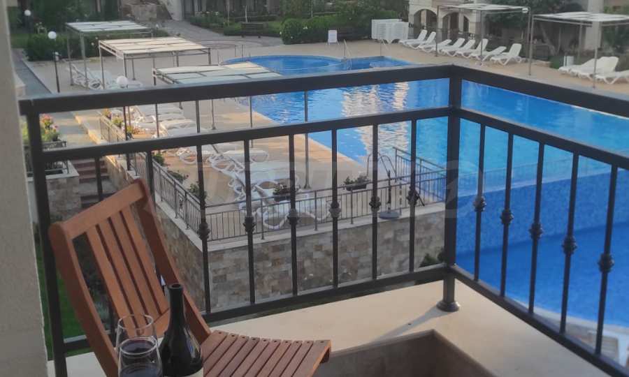 The cozy complex consists of two 6-story buildings, located opposite each other and two single-story buildings, positioned on both sides of the main entrance. Two new 6-story buildings are under construction, which will be parallel to the others and together will form a complete circle around the pool and garden of the complex. The complex has a swimming pool with a children's section and a second, separate children's pool, a playground and a reception. There is a wonderful restaurant, and there are parking spaces next to the building. In the area there is a large supermarket, a SPA and fitness center, restaurants and other amenities.