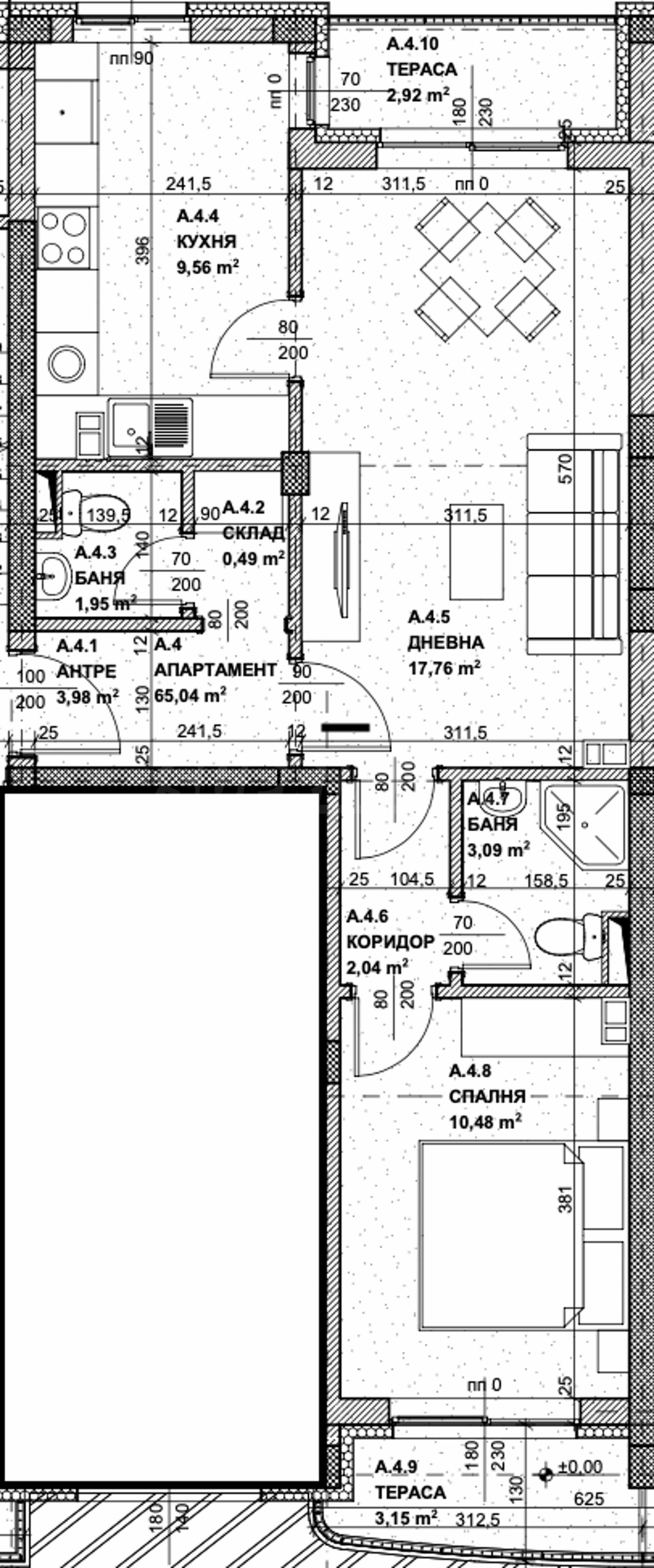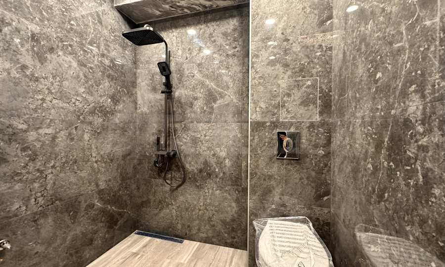 The heating is provided by gas, and the entire apartment has underfloor heating, which is very important for ground floor properties. The floors are made of granite tiles, painted walls and two fully equipped bathrooms are ready.