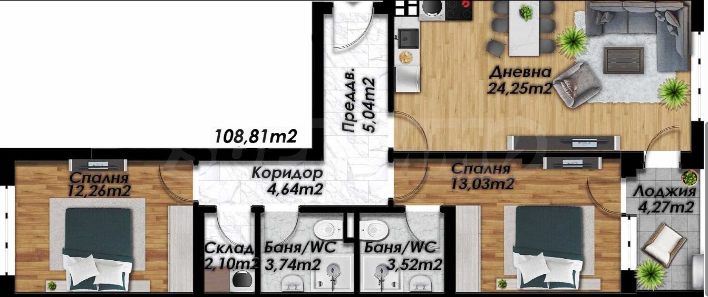 We present a three-bedroom apartment in a new complex, in the "Belomorski" district. The area is one of the fastest developing in Plovdiv. It is extremely desirable and sought after due to the presence of numerous parks, large food chains and a quick connection to both the city center and the ring road and the Southern Industrial Zone. New pedestrian and bicycle paths, children's parks and public parking lots are constantly being built in the neighborhood. Close by there are schools, kindergartens and all the necessary communications for the needs of a modern person.
