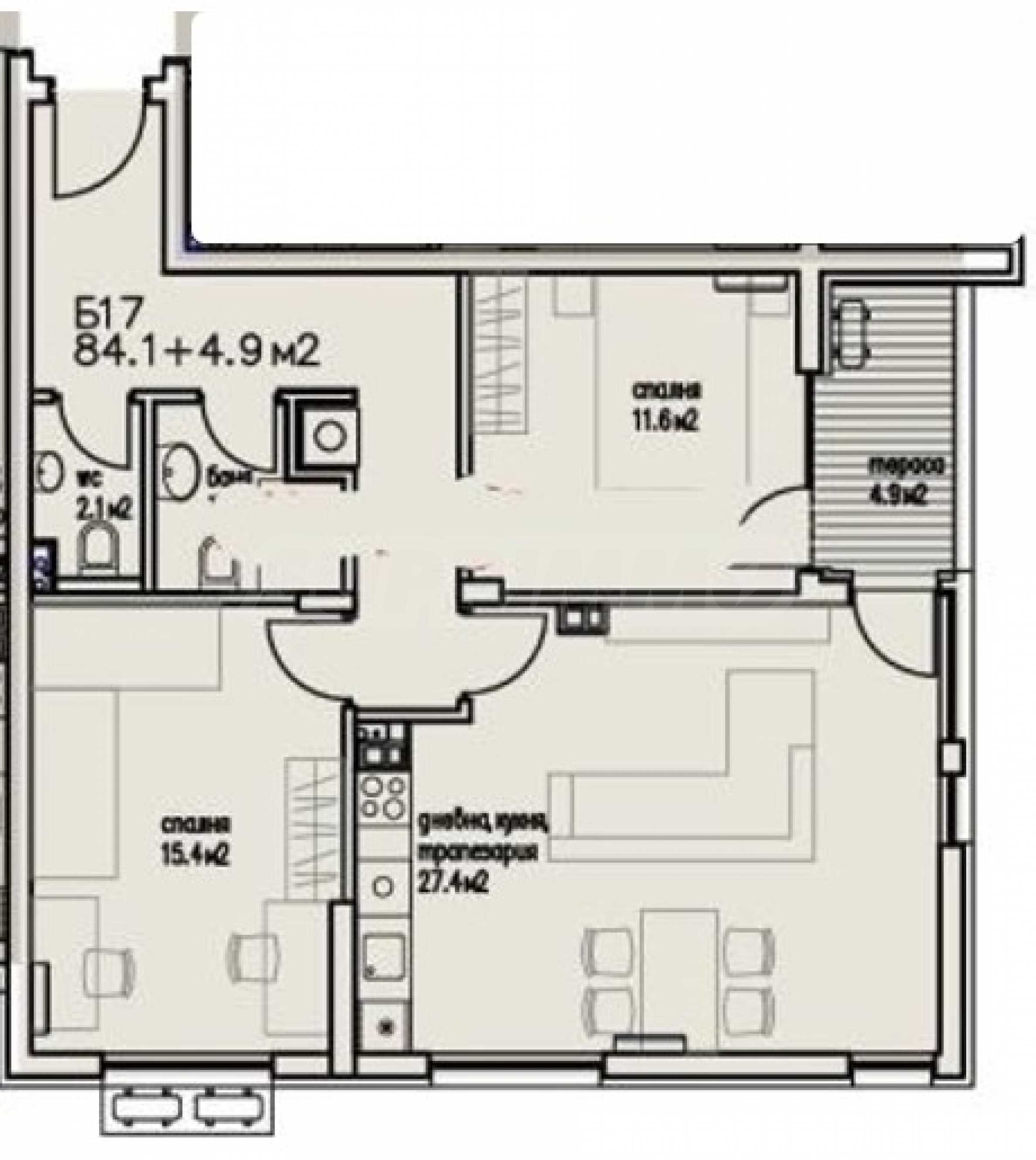 The property has a total area of 103.29 sq m, located on the 2nd floor. It is being let in a state of completion according to Bulgarian Construction Standards, with plaster and screed, quality construction.