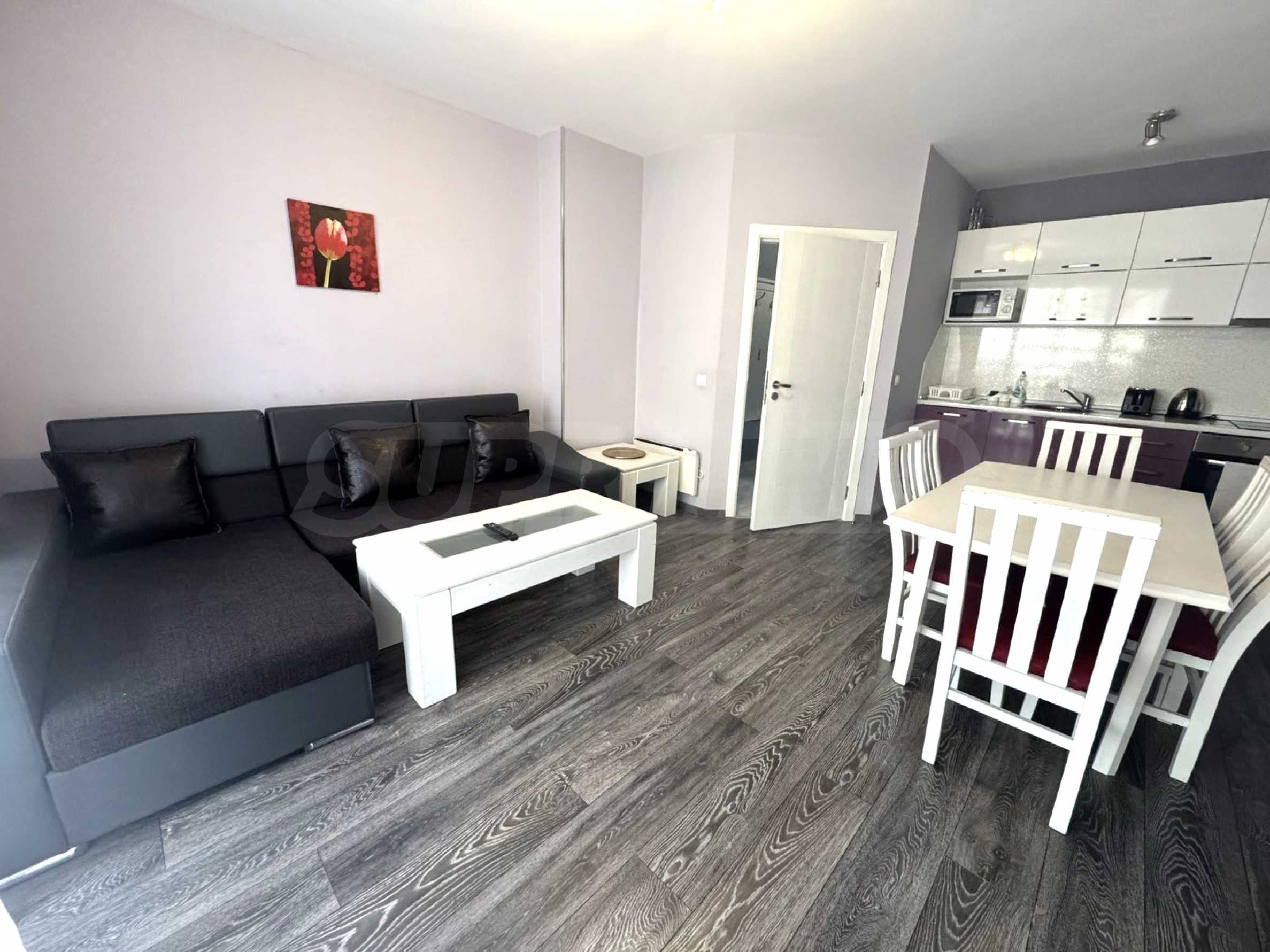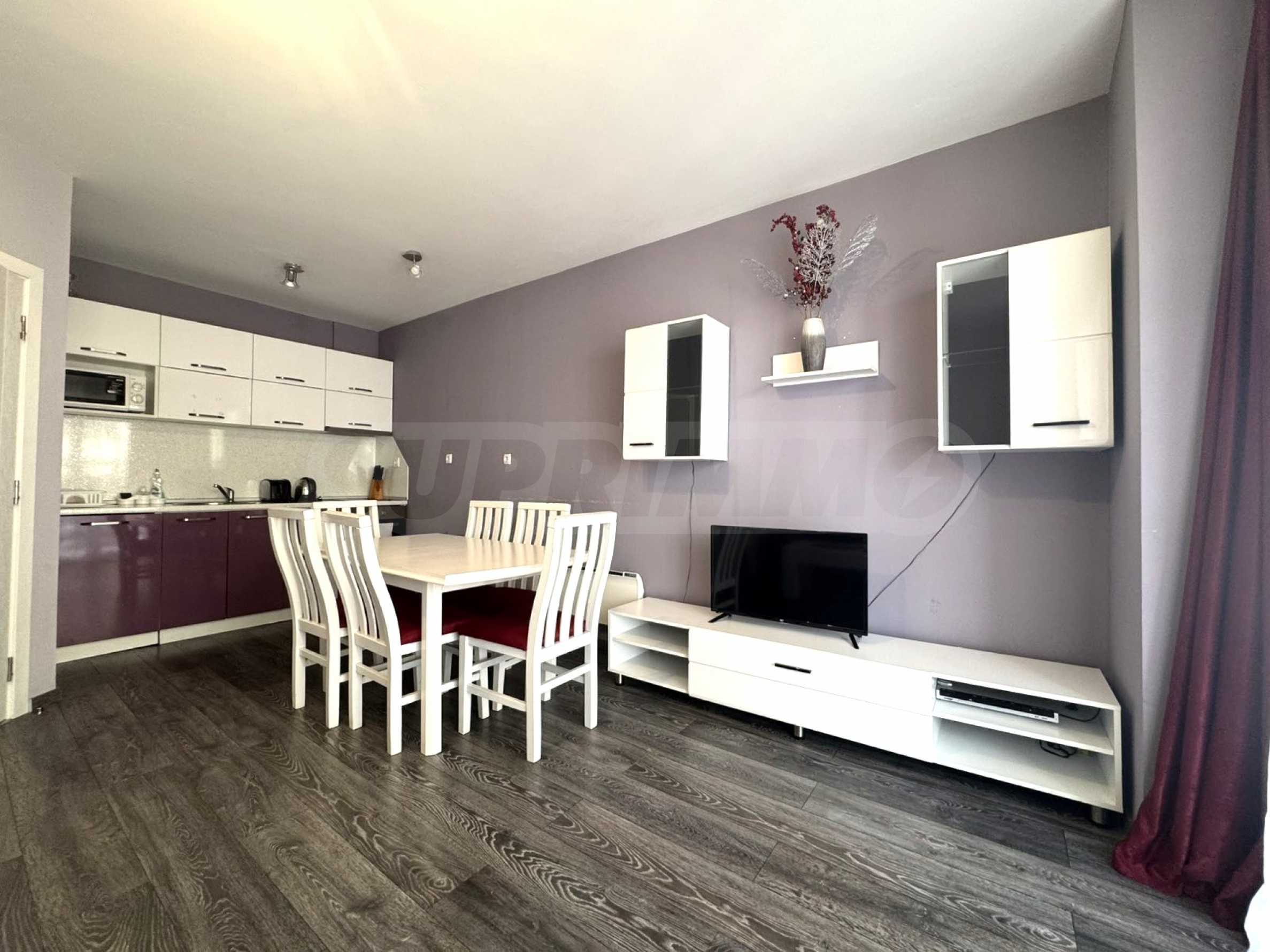 The maintenance fee is 12 euros per sq m per year and includes cleaning and lighting of the common areas, elevator, cable TV, internet and a SPA center with an indoor swimming pool (open during the winter season).