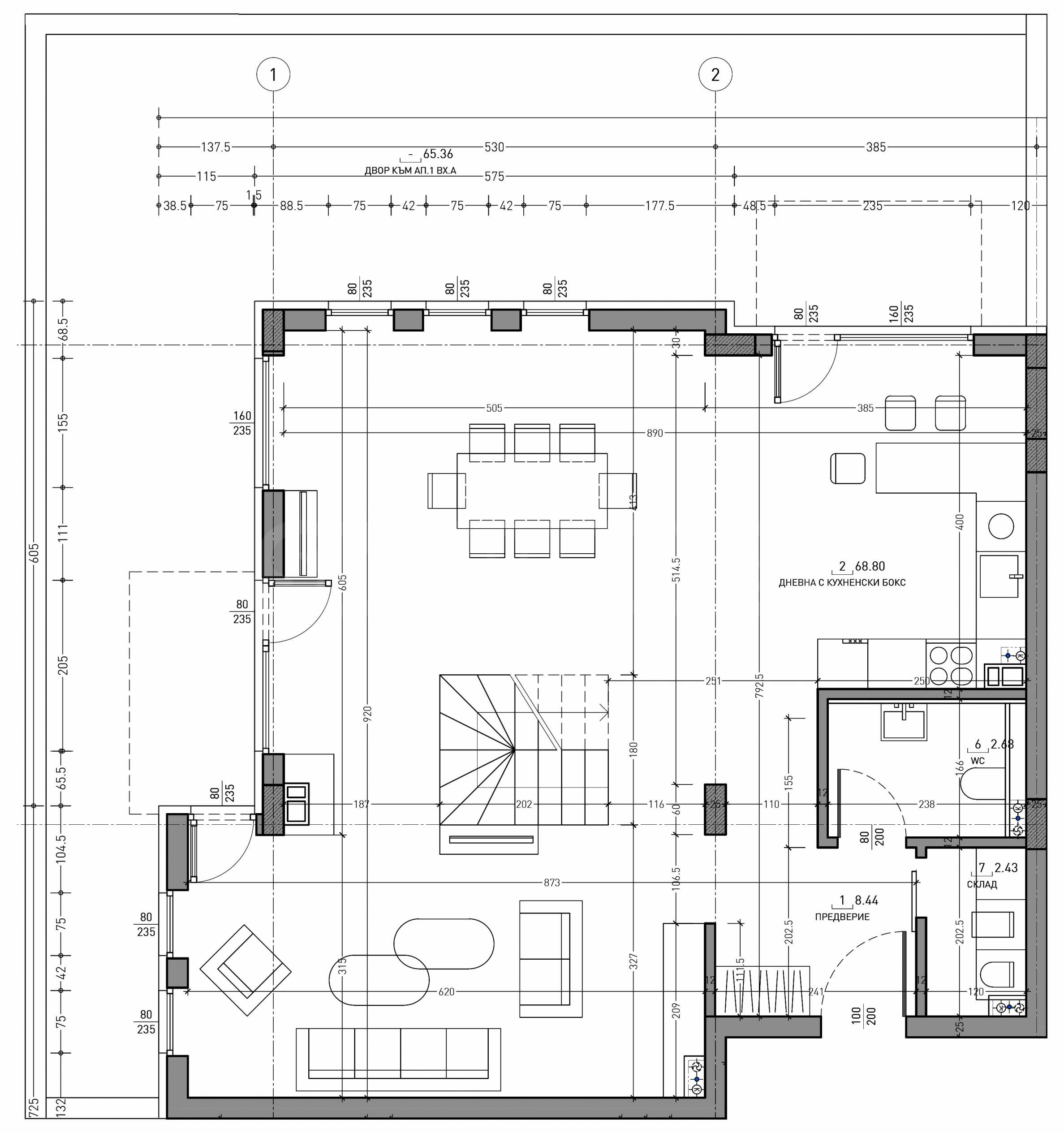 - first level - entrance hall, storage room, bathroom/toilet, living room with kitchen and dining room, yard - 65.36 sq m;