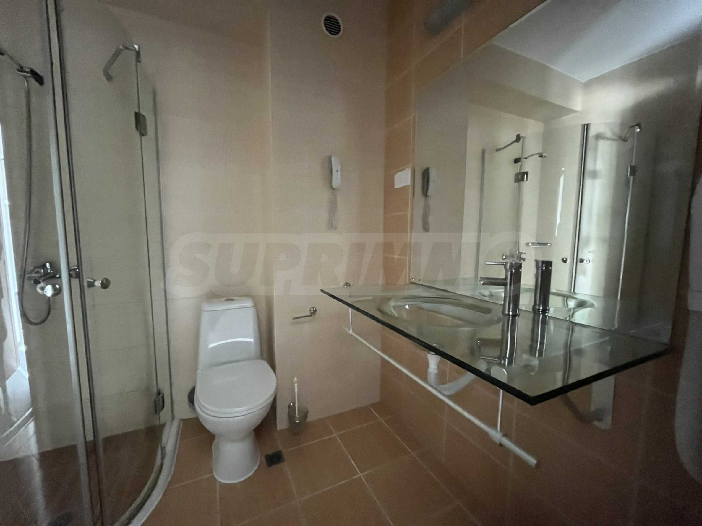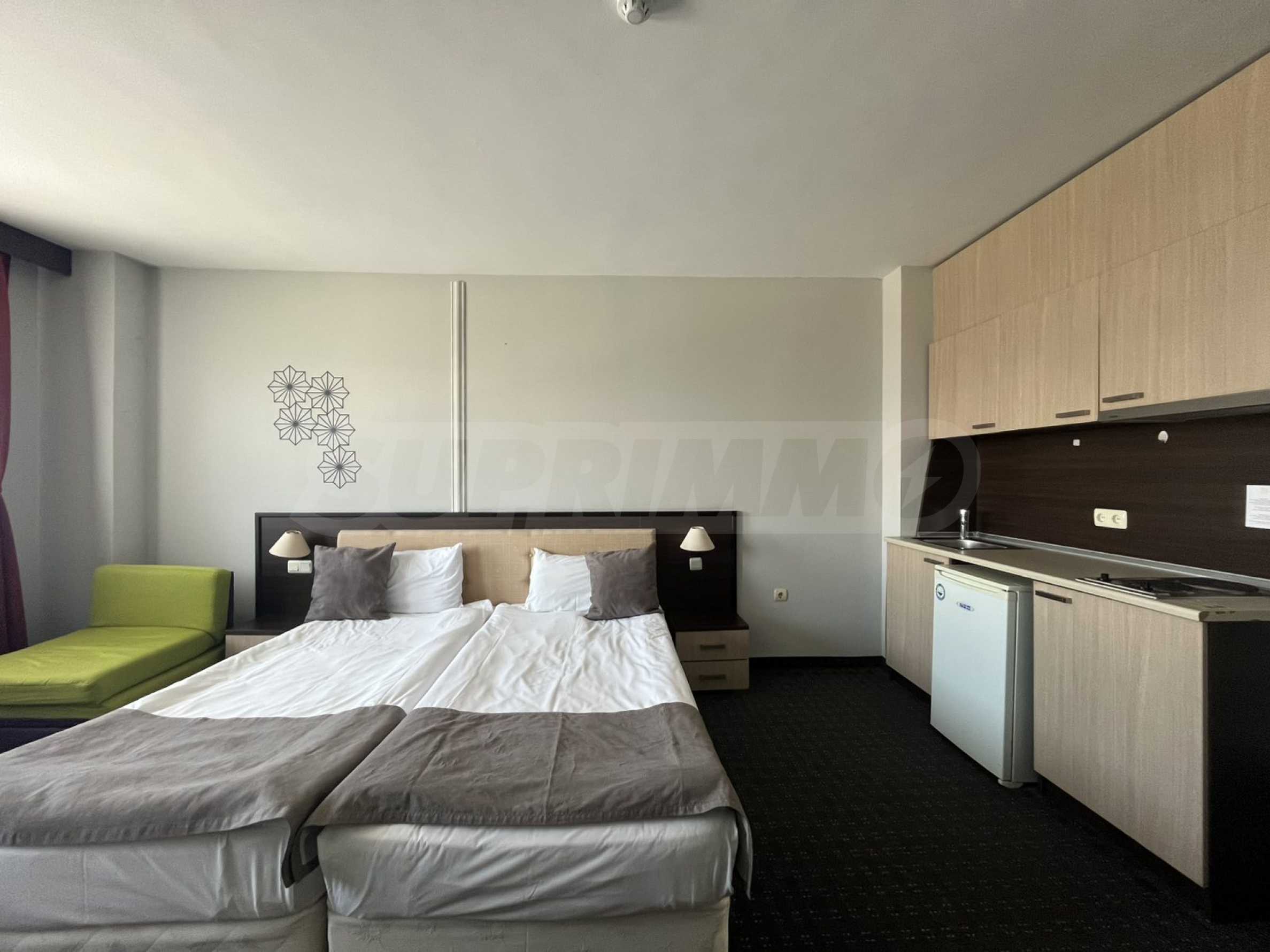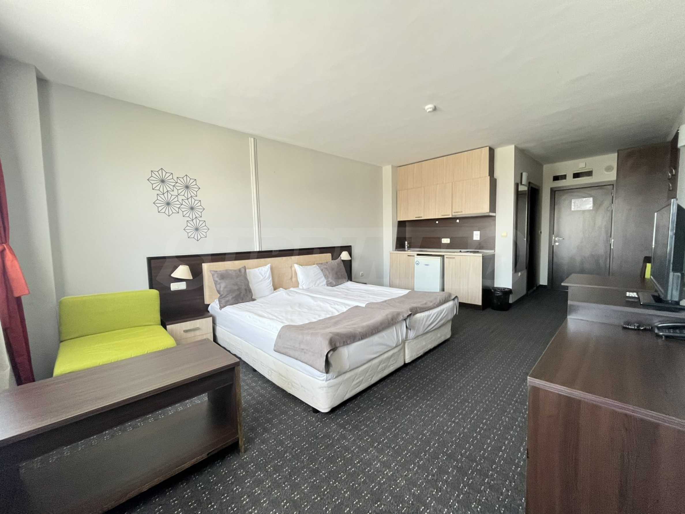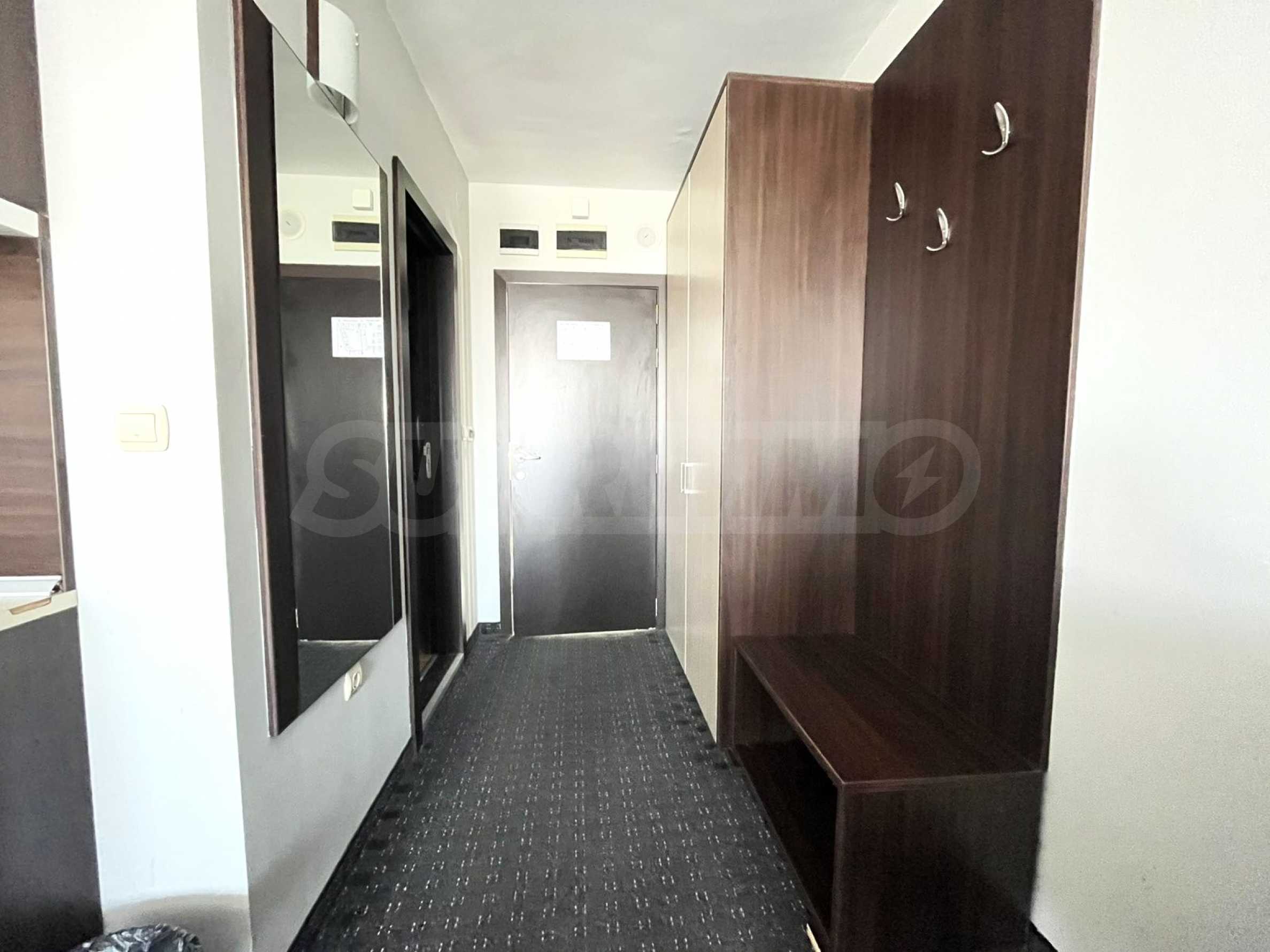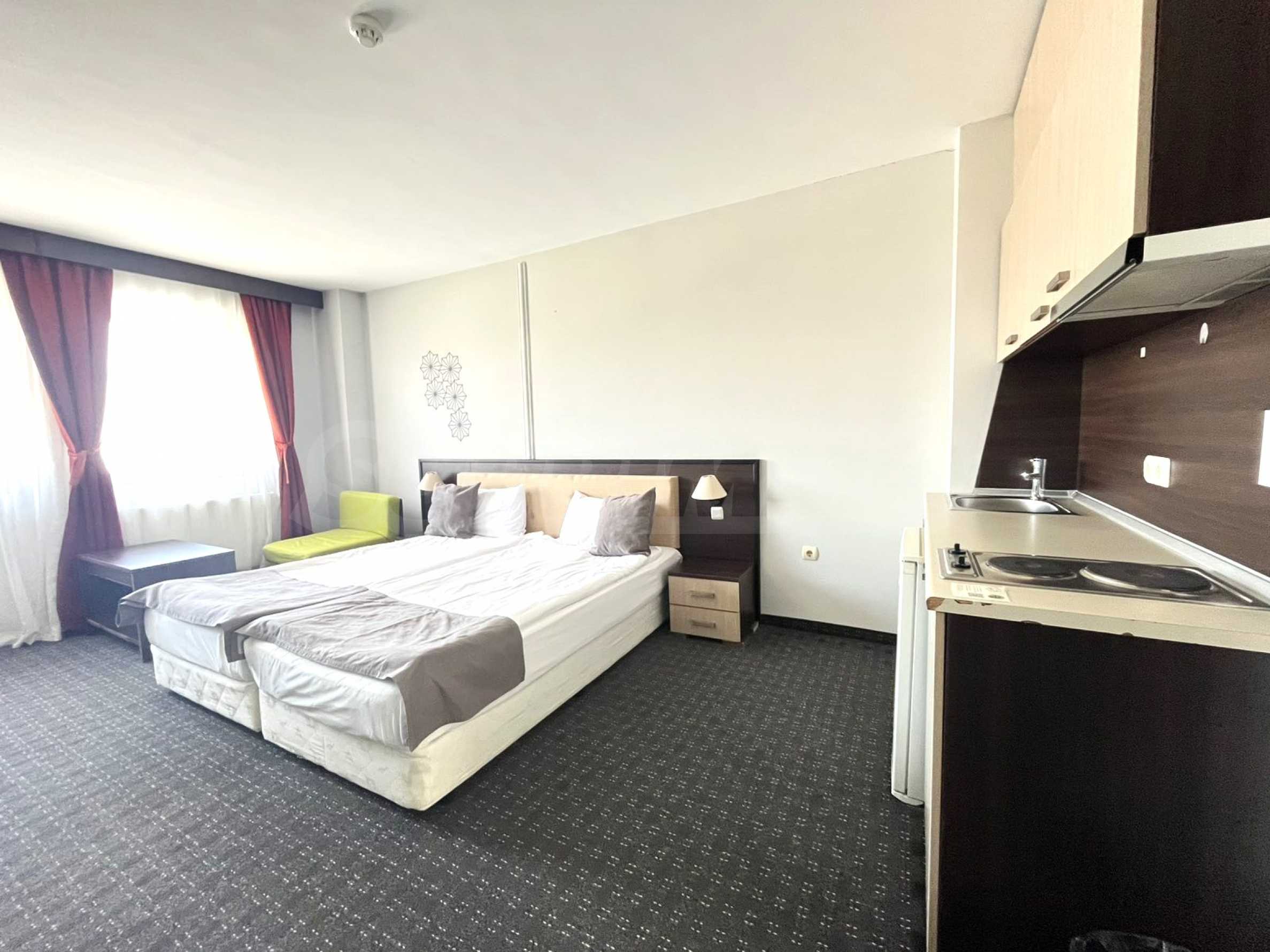 The apartment consists of: hallway, double bed, chest of drawers, TV, bathroom with toilet, sofa, coffee table.